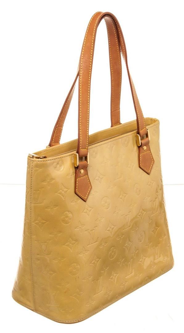 Louis Vuitton Yellow Monogram Canvas Houston Shoulder Bag vernis leather trimmed with tan leather and silver hardware. Top zipper closure opens to a black canvas lined interior that holds 1 zipped and 2 slit side pockets.