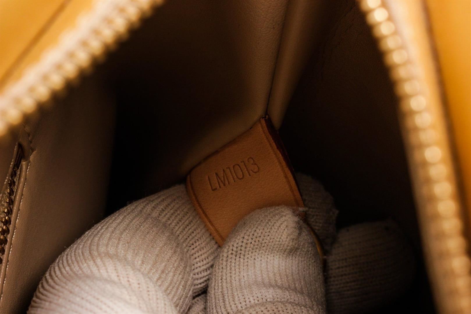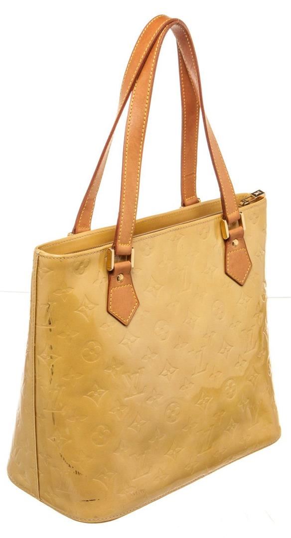 Louis Vuitton Yellow Monogram Canvas Houston Shoulder Bag vernis leather trimmed with tan leather and silver hardware. Top zipper closure opens to a black canvas lined interior that holds 1 zipped and 2 slit side pockets.
