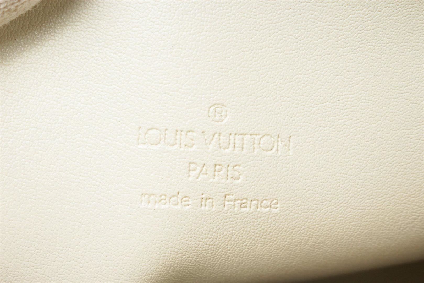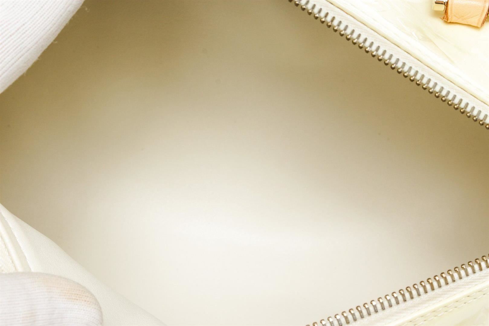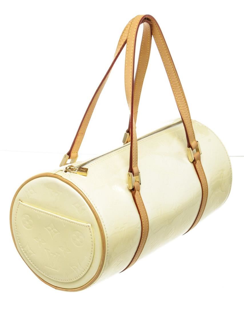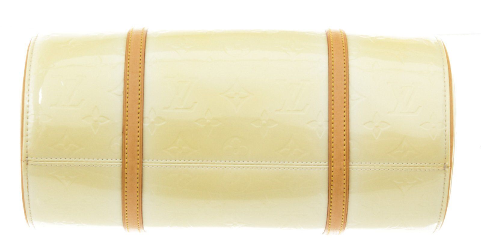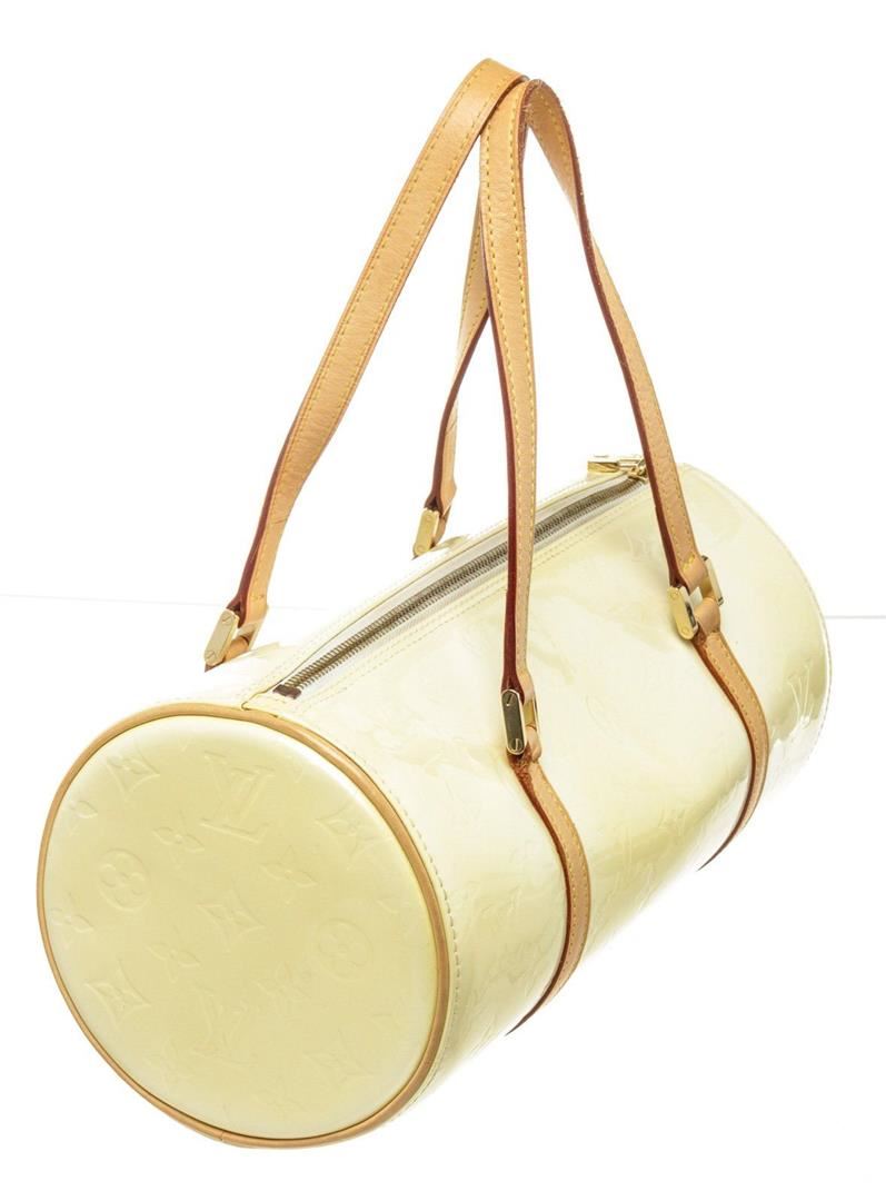 Louis Vuitton Yellow Monogram Vernis Bedford Handbag with vernis leather, gold-tone hardware, trim tan vachetta leather, leather lining, shoulder strap and zipper closure.