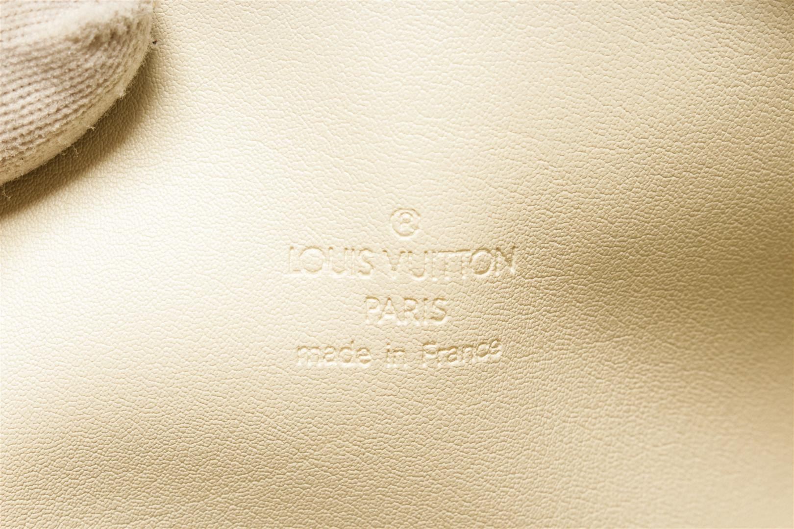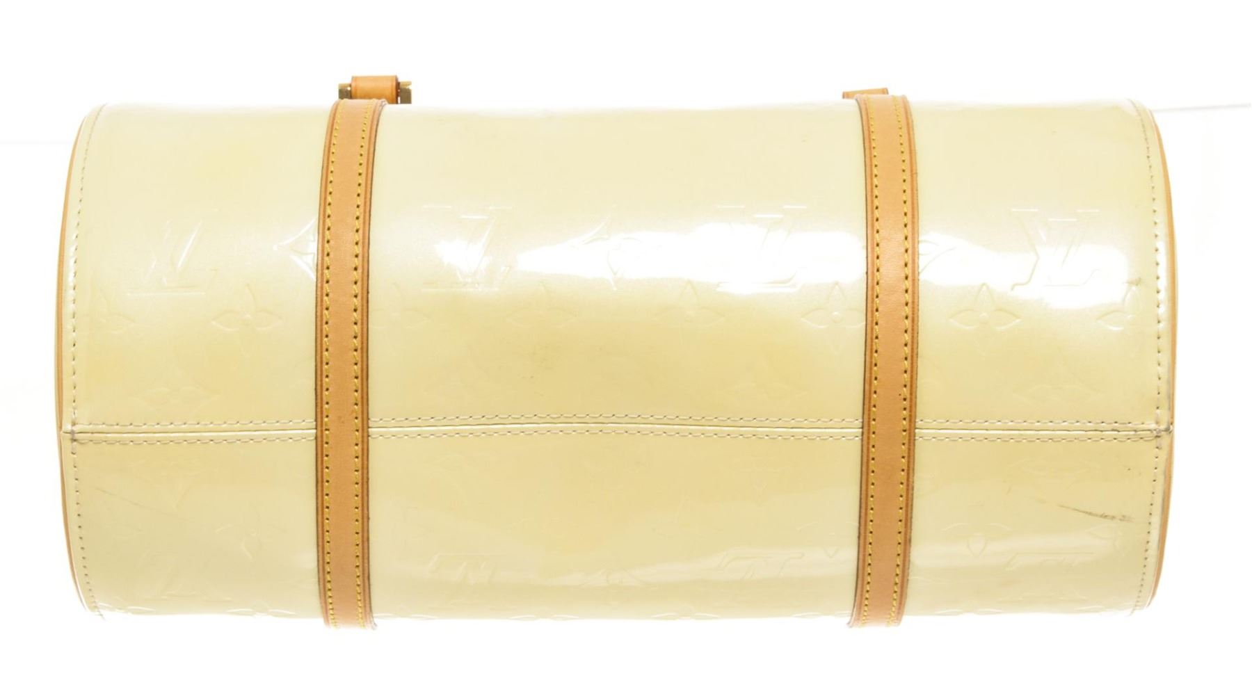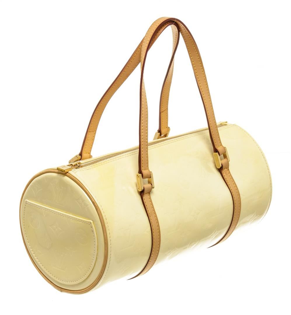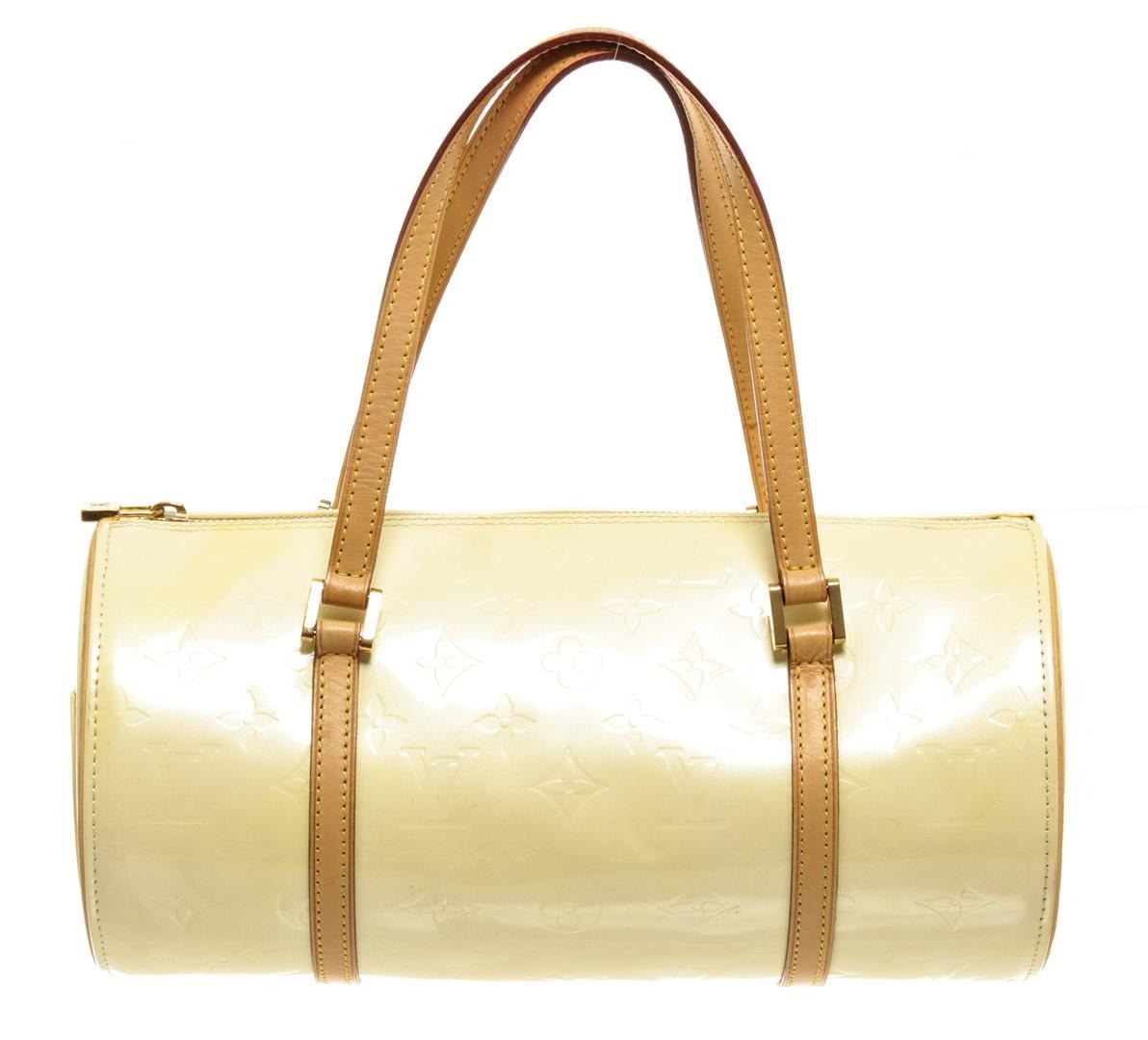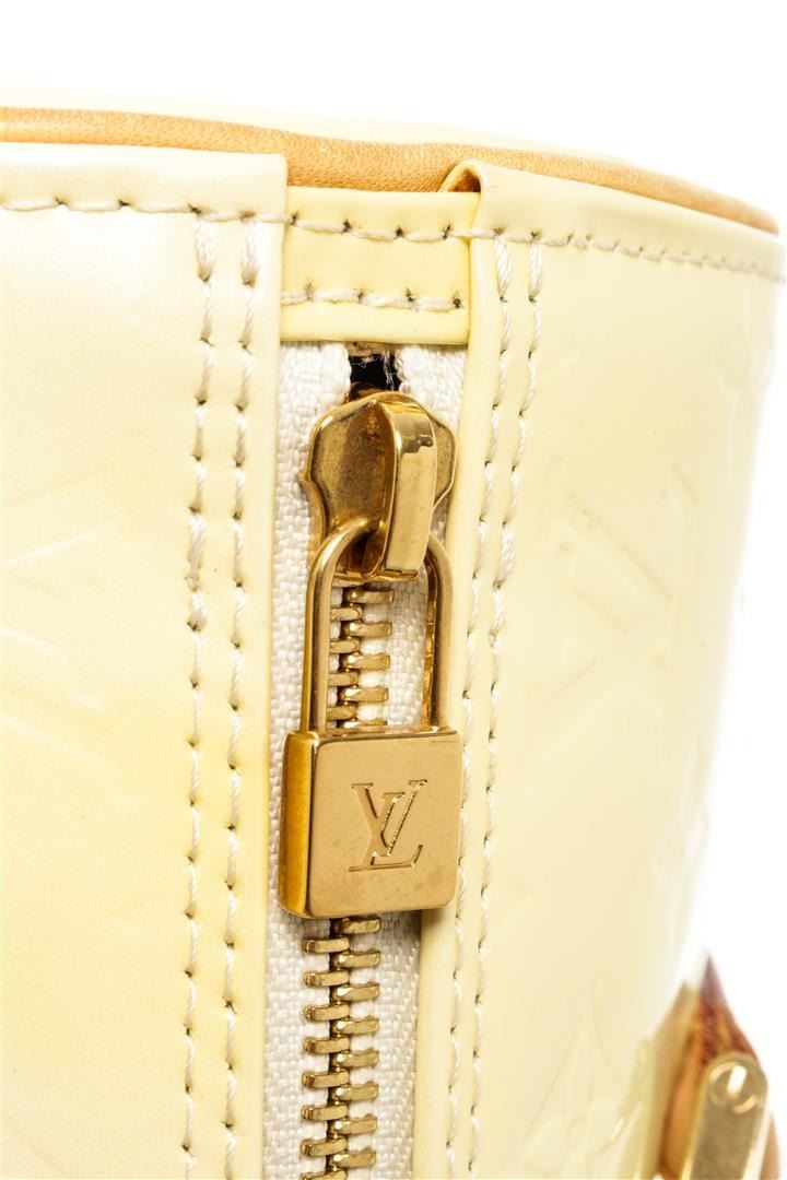 One Louis Vuitton Yellow Monogram Vernis Bedford Handbag. Item is sold AS-IS. All available information is listed in the description and shown in the photo. Louis Vuitton Yellow Monogram Vernis Bedford Handbag with vernis leather, gold-tone hardware, trim tan vachetta leather, leather lining, shoulder strap and zipper closure.