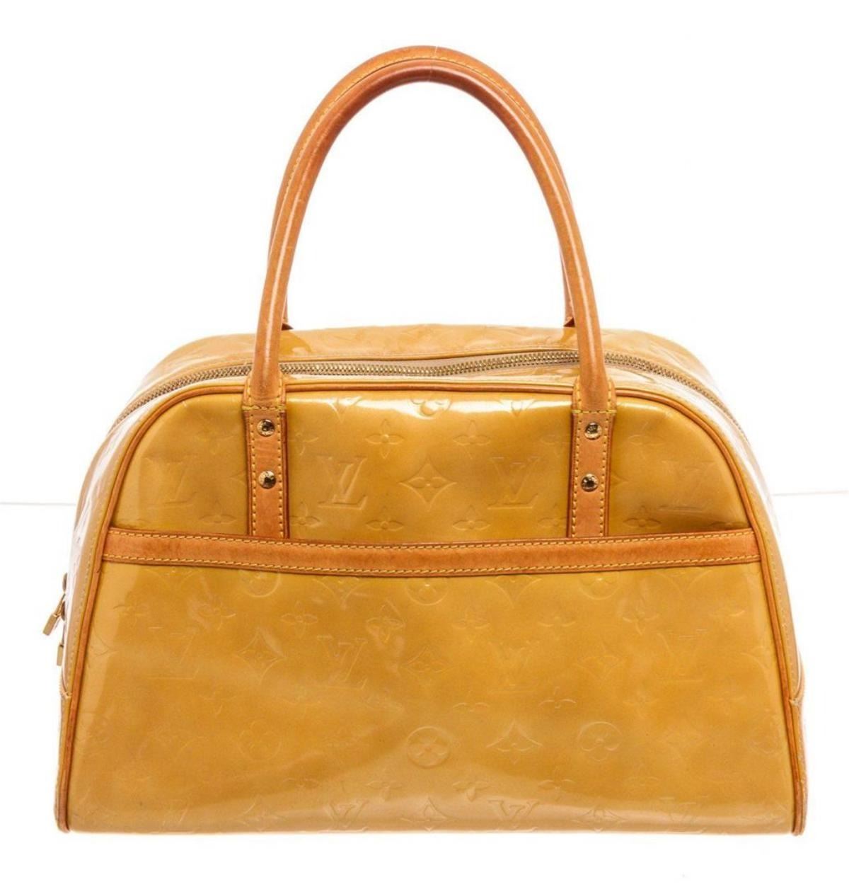 Louis Vuitton Yellow Monogram Vernis Tompkins Handbag. Louis Vuitton Yellow Monogram Vernis Tompkins Handbag with material monogram vernis, gold-tone hardware, trim tan vachetta leather, interior slip pockets, leather lining, dual top handle and zipper cl