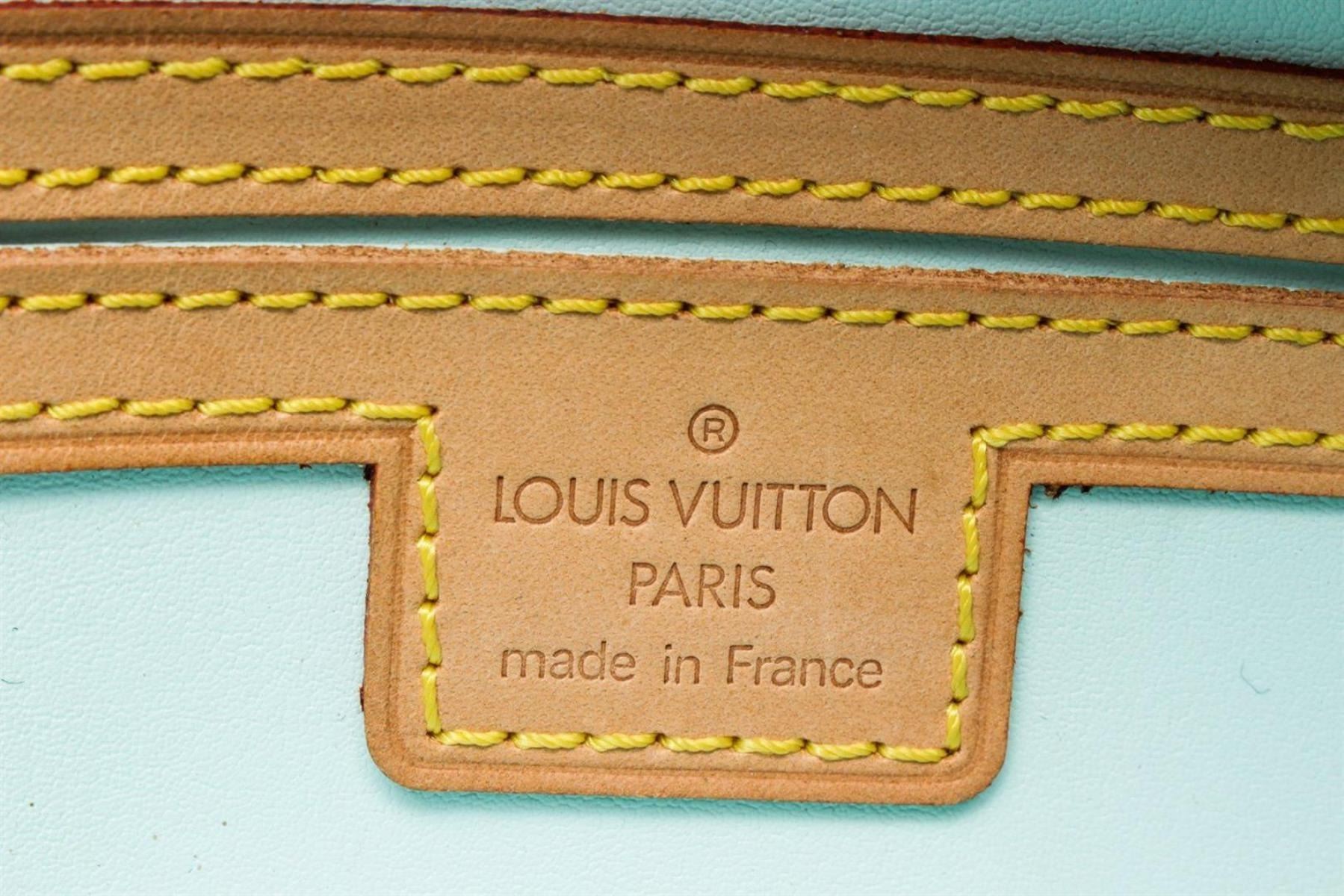 Louis Vuitton Yellow Monogram Verns Leather Fleur Pochette Crossbody Bag with monogram vernis leather, brass hardware, tan vachetta trim, yellow and multicolor leather flower accents at exterior, purple leather lining and zip closure at top.