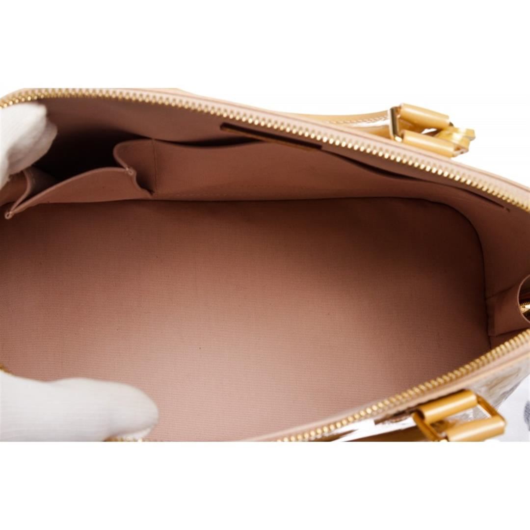 One Louis Vuitton Yellow Vernis Leather Monogram Alma PM Bag. Monogram Vernis leather Louis Vuitton Alma PM with brass hardware, dual rolled top handles, tonal canvas lining, dual interiorit pockets and two-way zip closure at top. Item is pre-owned.