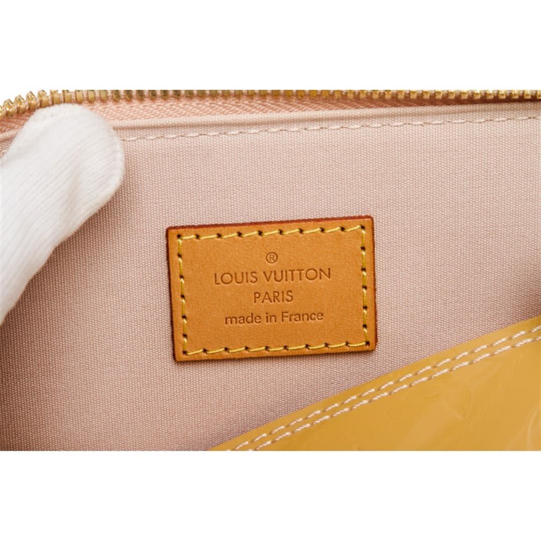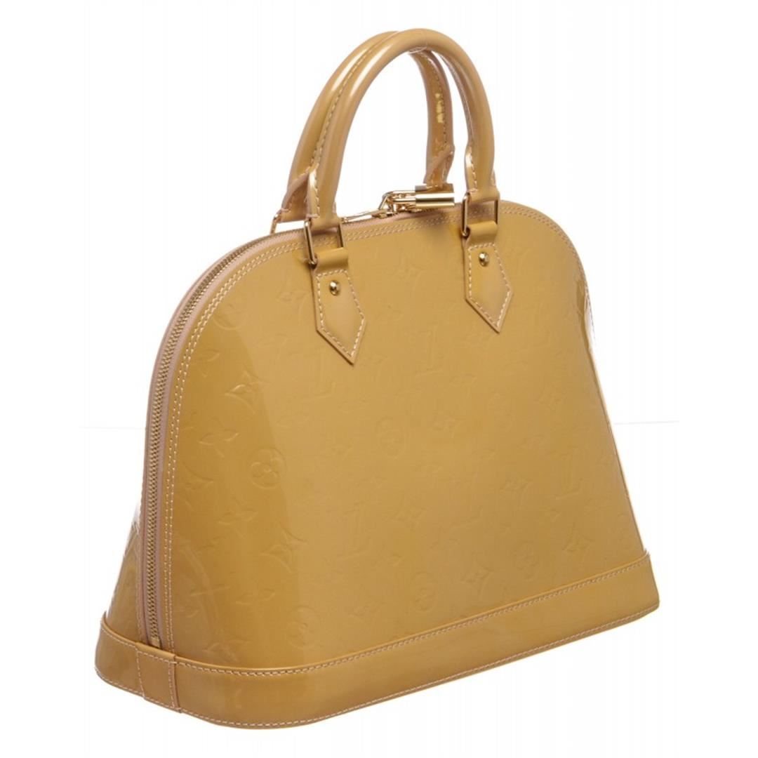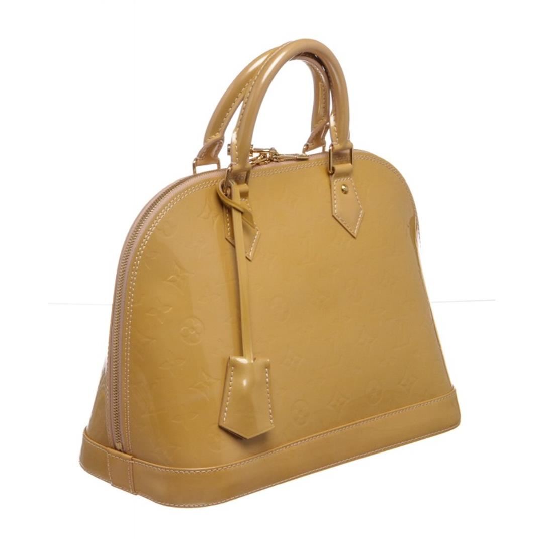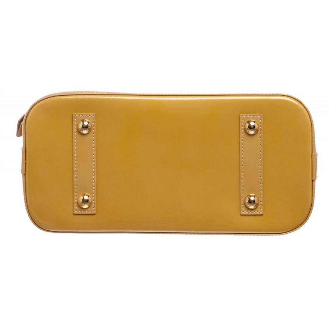 One Louis Vuitton Yellow Vernis Leather Monogram Alma PM Bag. Monogram Vernis leather Louis Vuitton Alma PM with brass hardware, dual rolled top handles, tonal canvas lining, dual interiorit pockets and two-way zip closure at top. Item is pre-owned.
