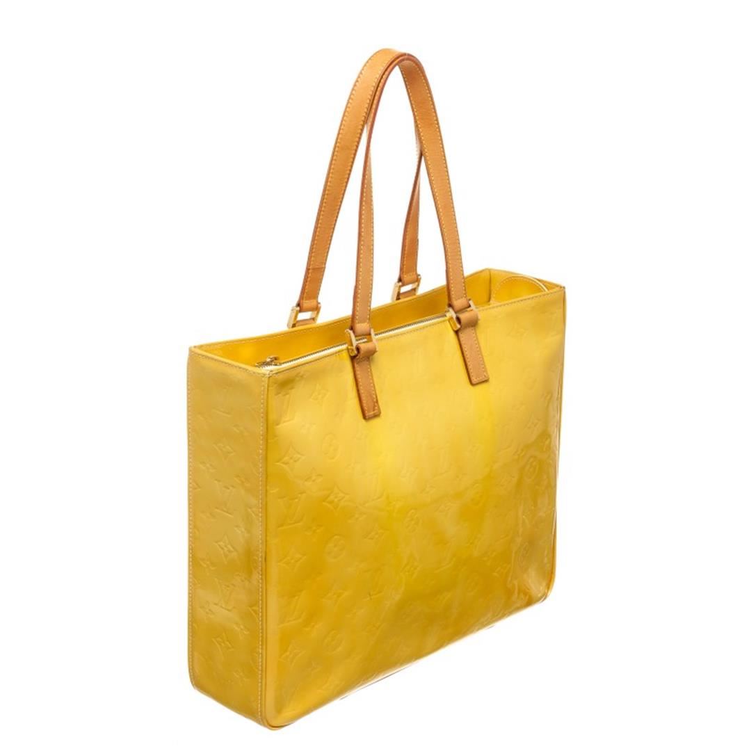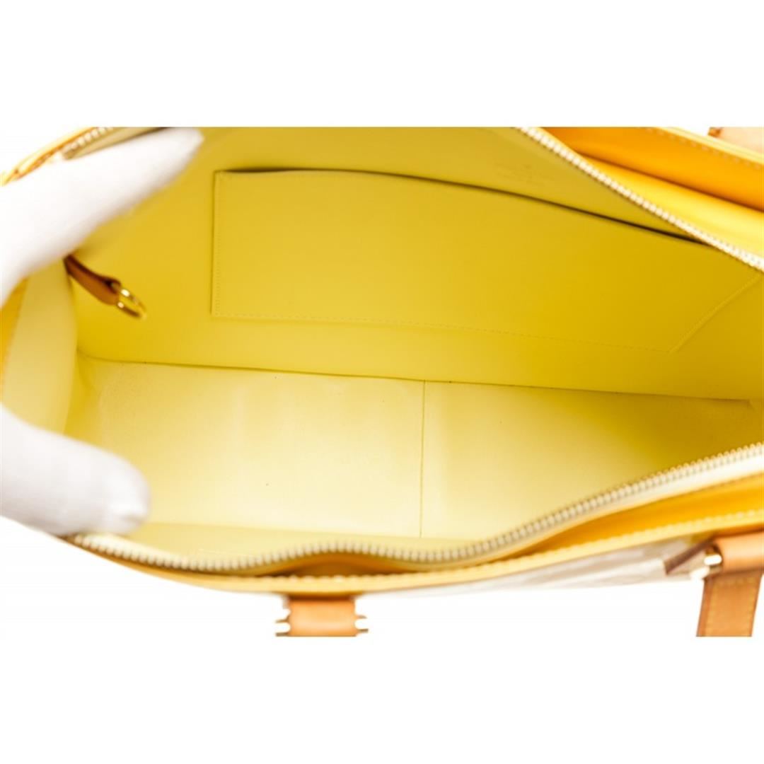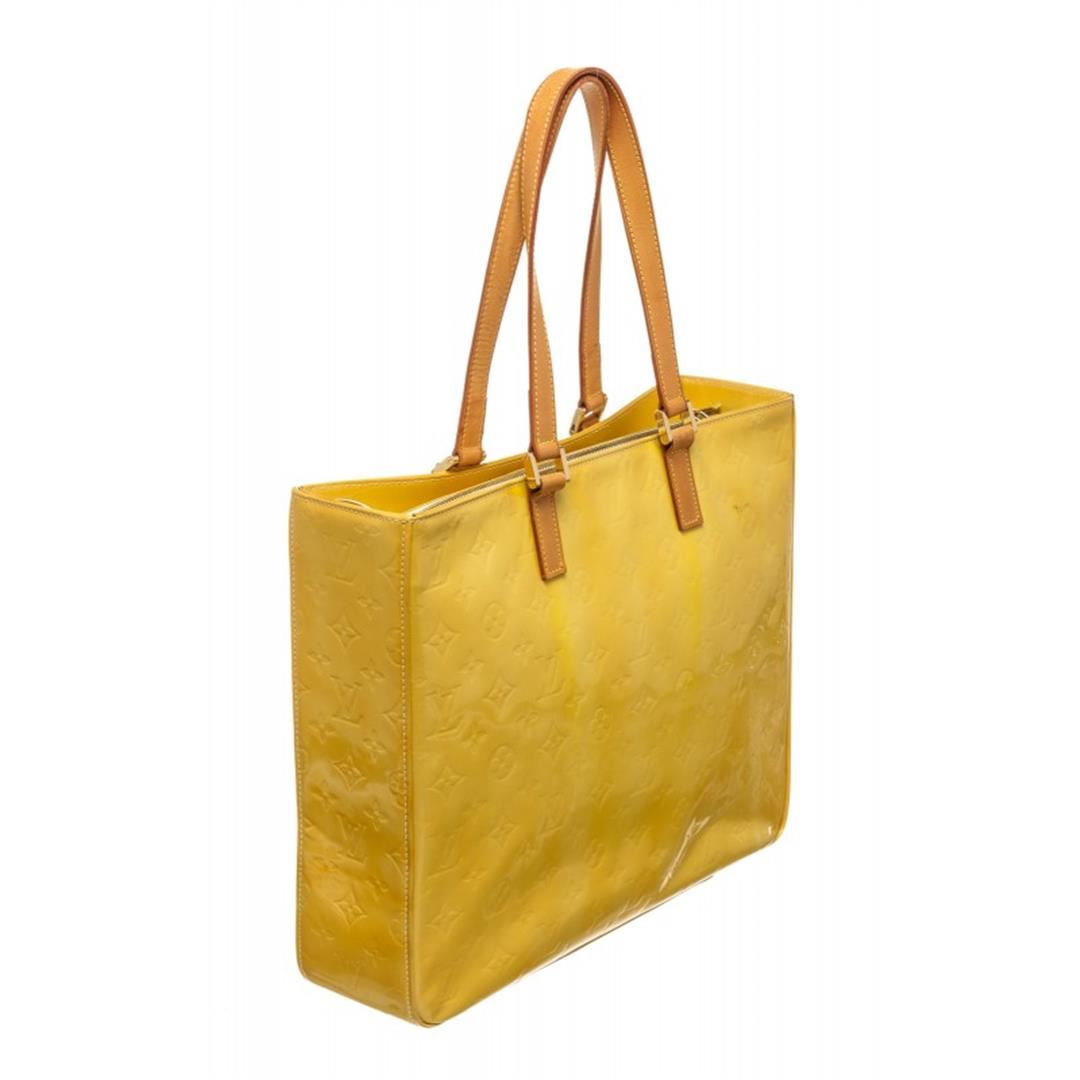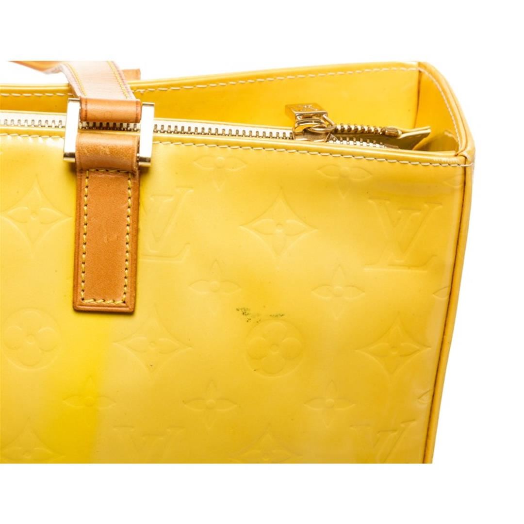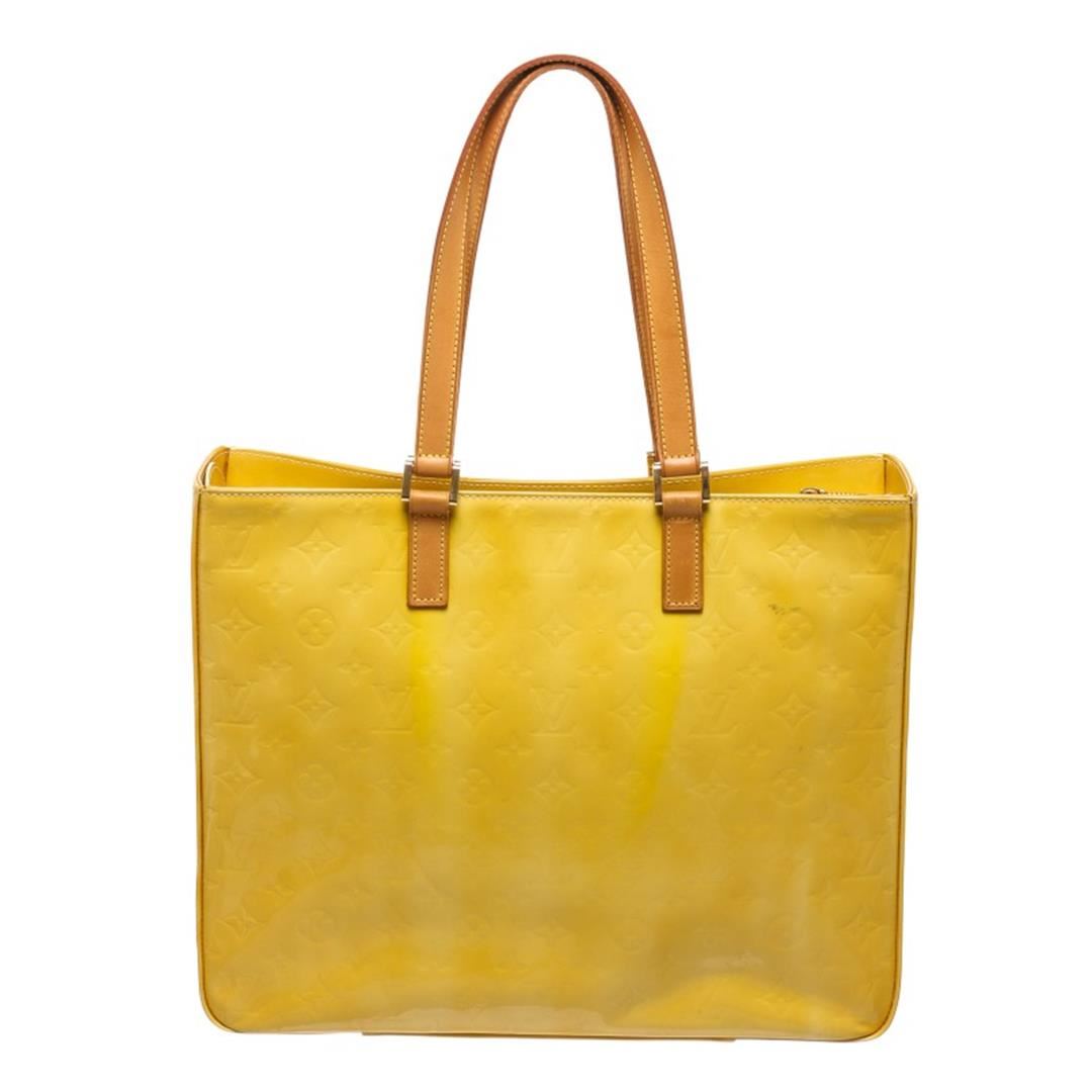 Monogram Vernis leather Louis Vuitton Columbus tote with brass hardware, tan vachetta leather accents, dual flat shoulder straps, leather interior, dual pockets at interior walls and zip closure at top.