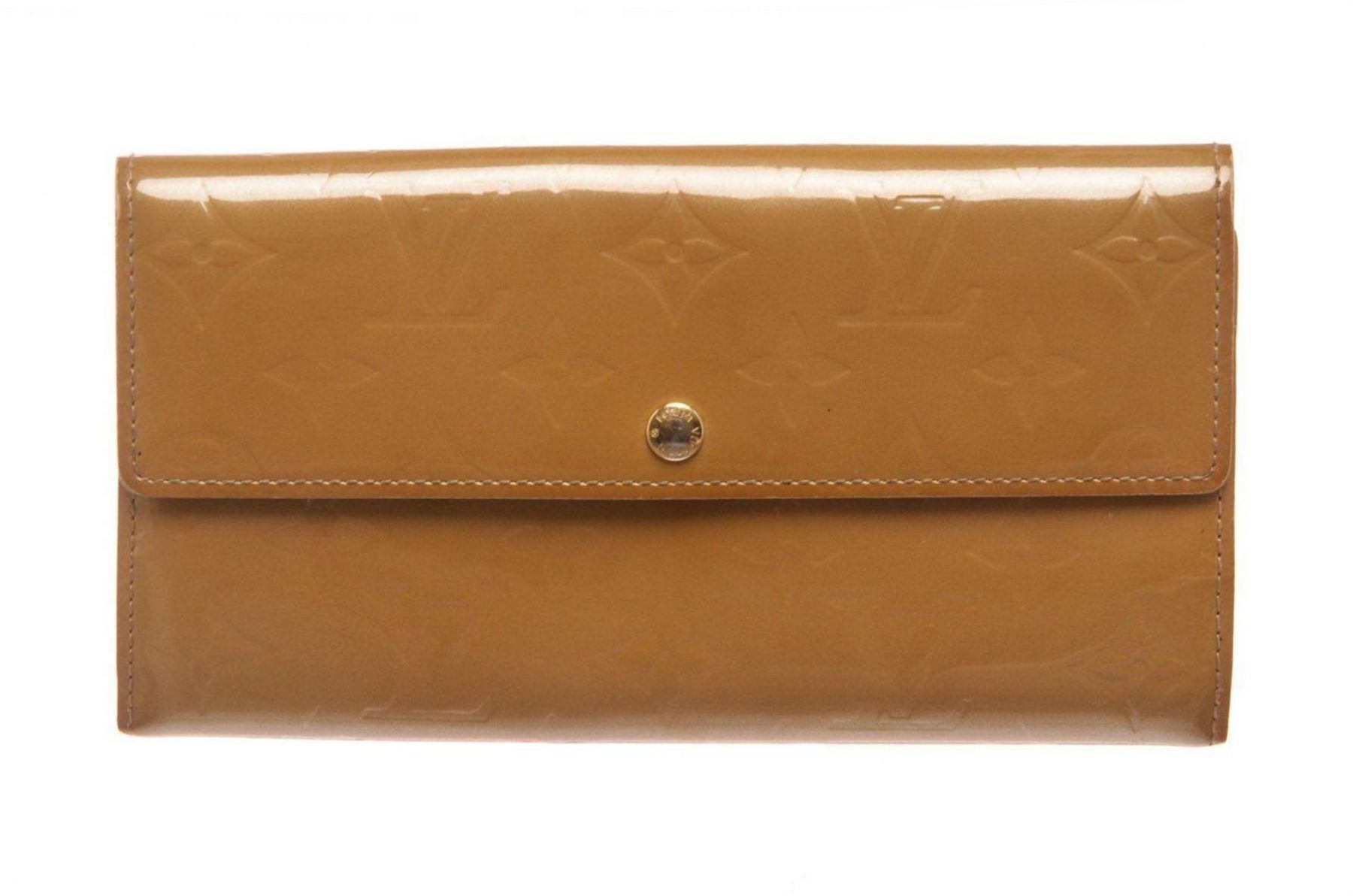 Louis Vuitton Yellow Vernis Monogram Sarah Wallet. Beige monogram Mat leather Louis Vuitton Sarah wallet with brass hardware, dual slip pockets at flap underside, tonal leather lining, dual interior pockets; one with zip closure, six card slots at interio