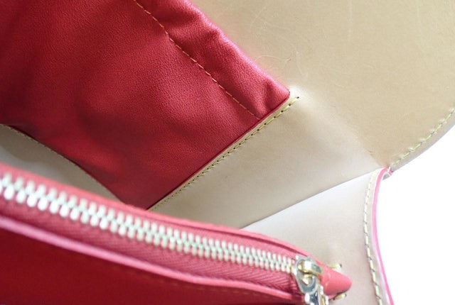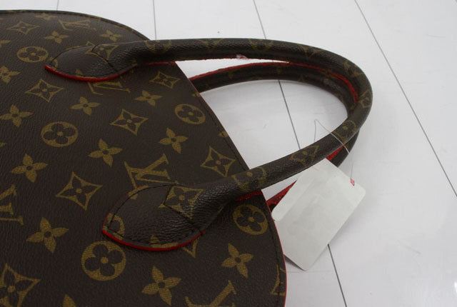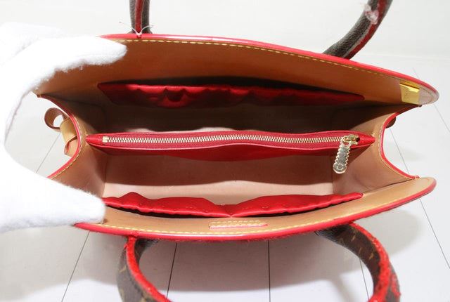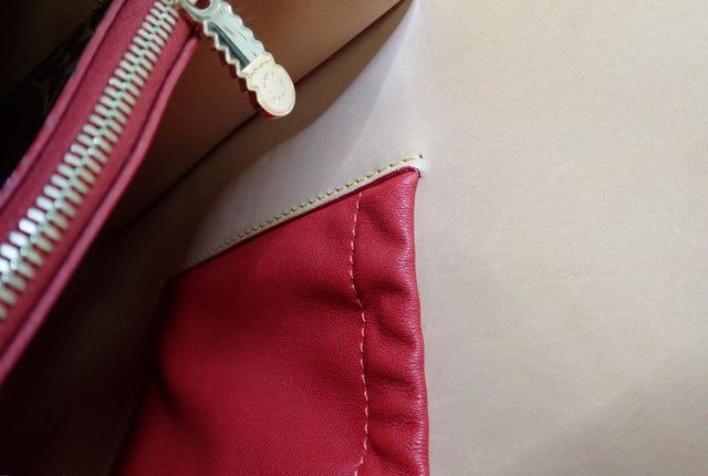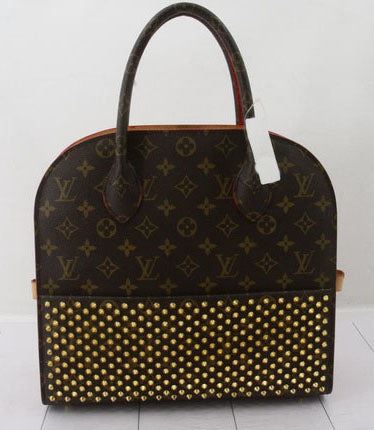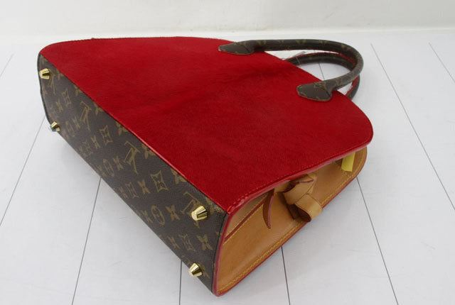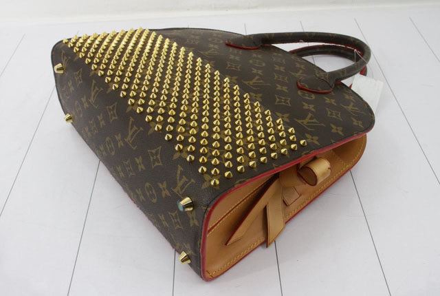 Brown and tan monogram coated canvas Louis Vuitton Iconoclasts Christian Louboutin Shopping bag with gold-tone hardware, tan vachetta leather trim, dual rolled top handles, exterior slip pocket featuring spiked embellishments at front, red ponyhair panel