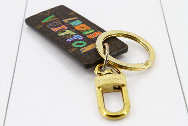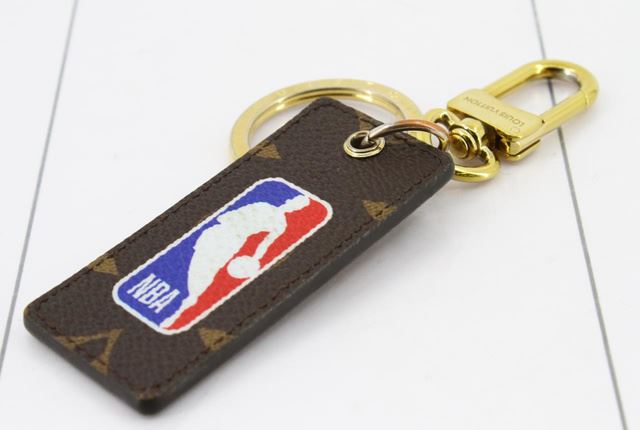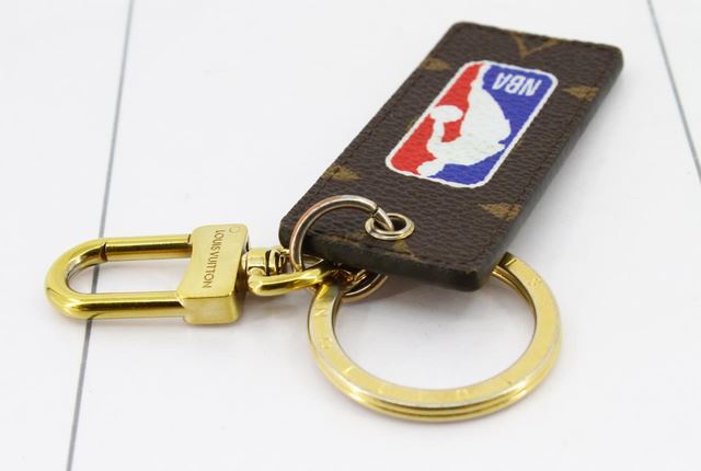 Louis Vuitton x NBA key chain features gold-tone hardware, brown and tan Monogram coated canvas with printed NBA logo at front and multicolor Louis Vuitton letters at back and D-ring hook closure.