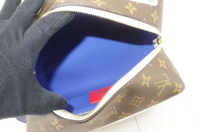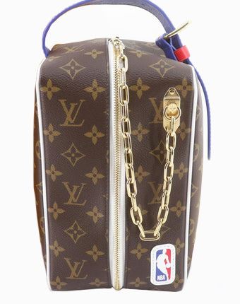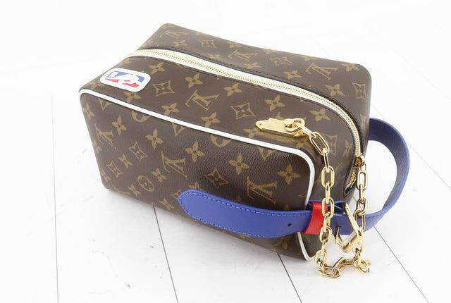 As part of the LV x NBA SEASON 2 capsule collection, the Cloakroom Dopp Kit is made from brown Monogram coated canvas and decorated with prints and patches inspired by basketball championship jackets. The adjustable leather handle with gold-tone hardware