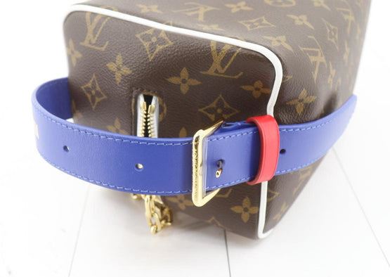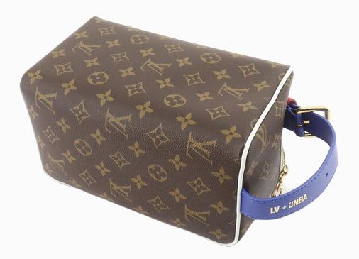 As part of the LV x NBA SEASON 2 capsule collection, the Cloakroom Dopp Kit is made from brown Monogram coated canvas and decorated with prints and patches inspired by basketball championship jackets. The adjustable leather handle with gold-tone hardware