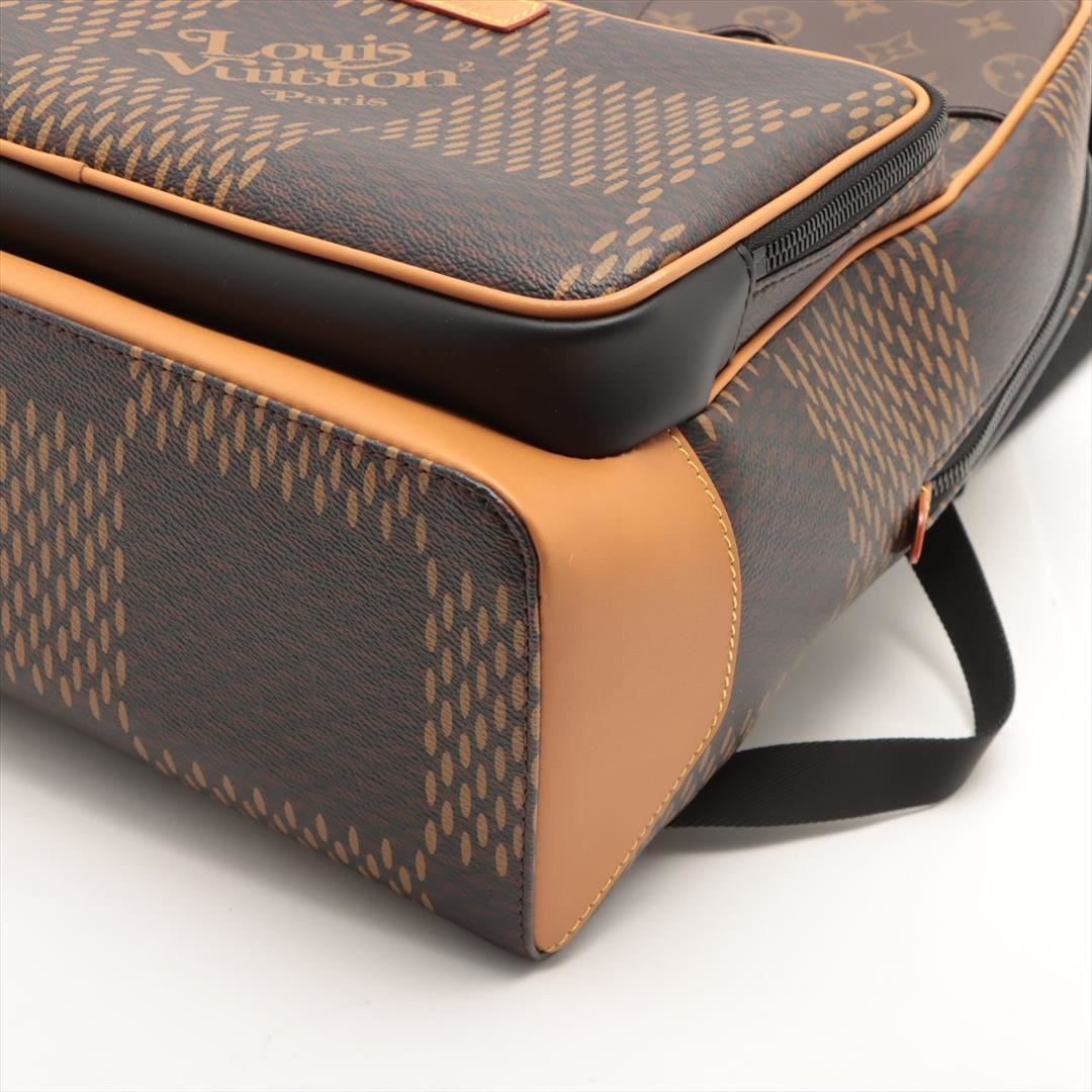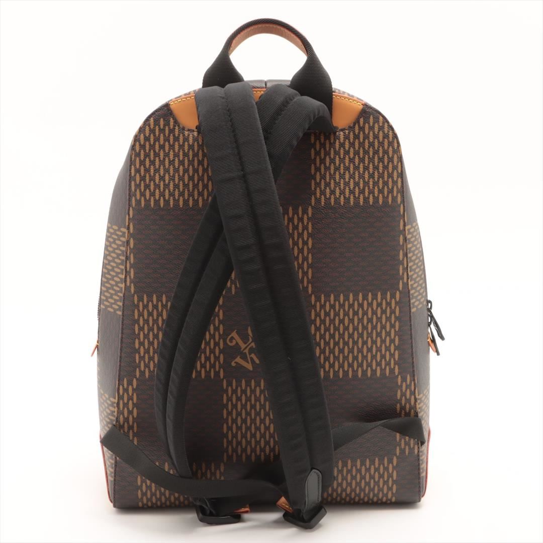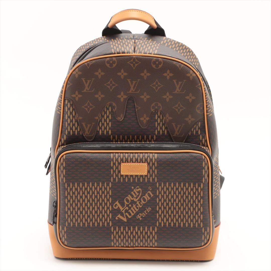 Brown tan monogram and Damier Geant coated canvas Louis Vuitton x NIGO Campus backpack with black hardware, tan leather trim, dual adjustable shoulder straps, single top handle, single exterior pocket with zip closure, black twill lining and zip closure a