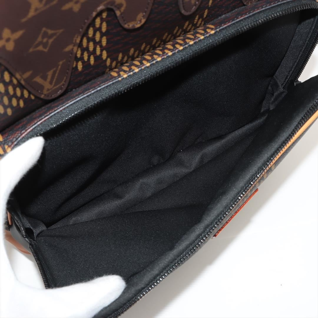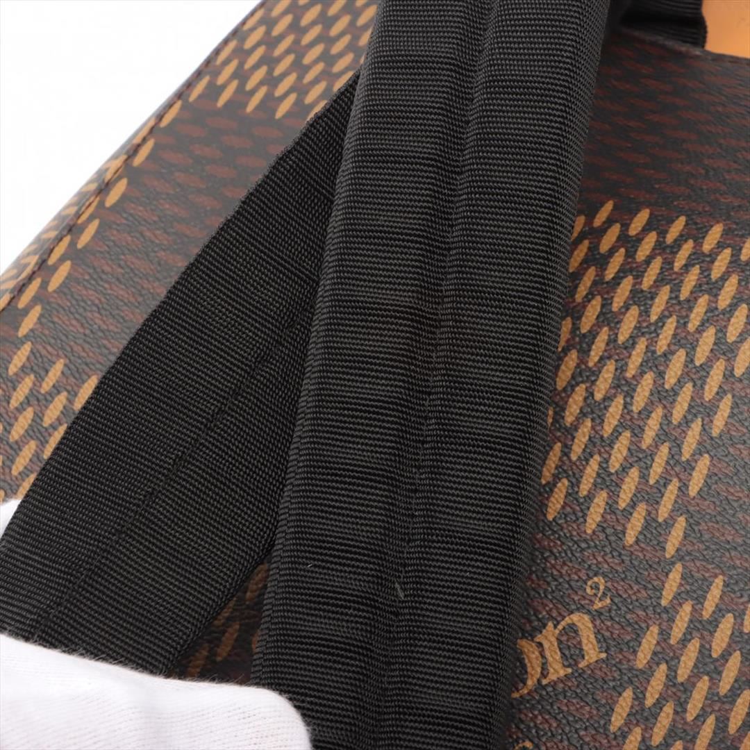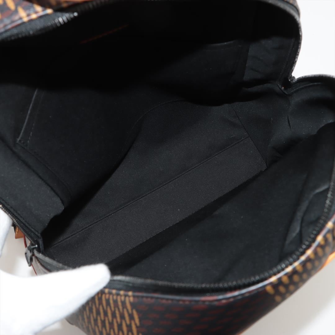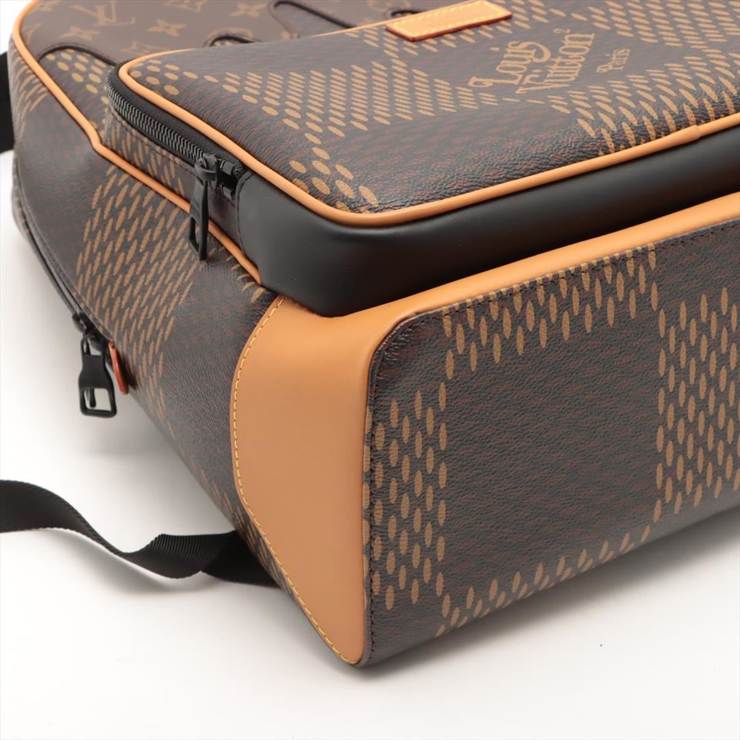 Brown tan monogram and Damier Geant coated canvas Louis Vuitton x NIGO Campus backpack with black hardware, tan leather trim, dual adjustable shoulder straps, single top handle, single exterior pocket with zip closure, black twill lining and zip closure a