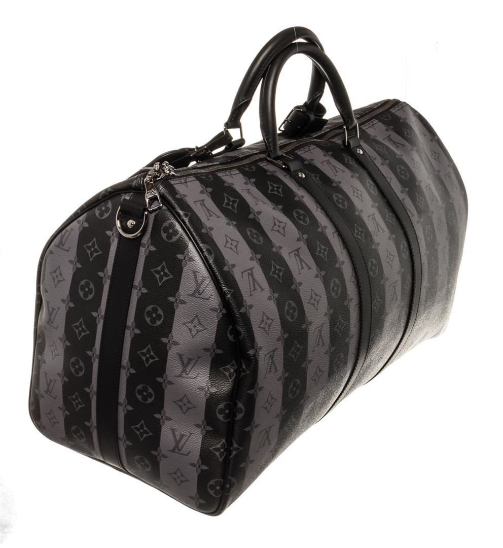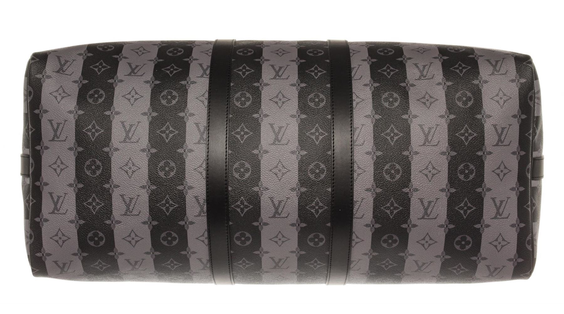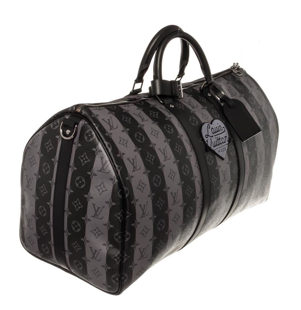 For the NIGO x Louis Vuitton capsule collection, Virgil Abloh and Japanese designer Nigo collaborated on this Keepall Bandouliere 55 travel bag in masculine Monogram Stripes Eclipse canvas. Reworking the Monogram pattern on stripes, Nigo creates a bag tha