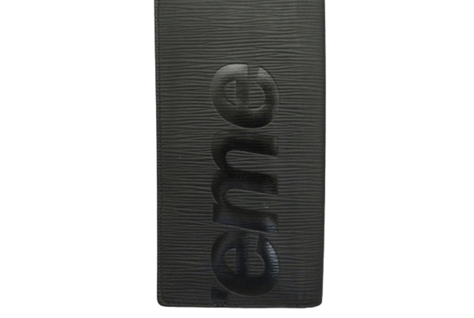 One Louis Vuitton x Supreme Black Epi Leather Brazza Wallet. Item is sold AS-IS. All available information is listed in the description and shown in the photo. Black Epi leather Louis Vuitton x Supreme Brazza wallet with silver-tone hardware, black Taiga leather lining, 16 credit card slots, large zipped compartment for coins and 4 inside flat compartments for bills and tickets. Height: 7.75" Width: 4" Depth: 0.5"