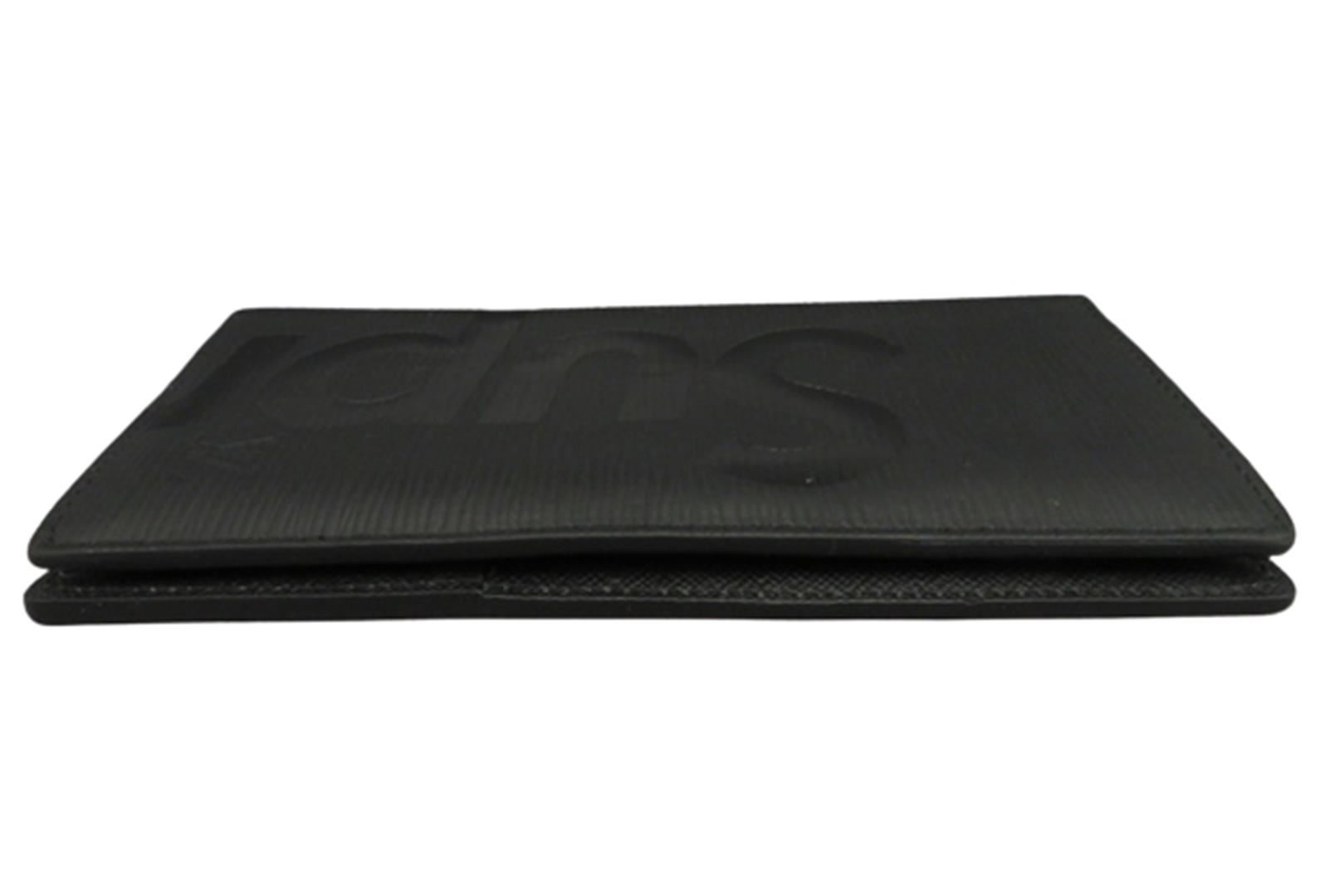 One Louis Vuitton x Supreme Black Epi Leather Brazza Wallet. Item is sold AS-IS. All available information is listed in the description and shown in the photo. Black Epi leather Louis Vuitton x Supreme Brazza wallet with silver-tone hardware, black Taiga leather lining, 16 credit card slots, large zipped compartment for coins and 4 inside flat compartments for bills and tickets. Height: 7.75" Width: 4" Depth: 0.5"