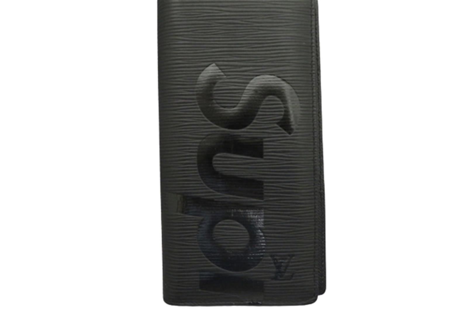 One Louis Vuitton x Supreme Black Epi Leather Brazza Wallet. Item is sold AS-IS. All available information is listed in the description and shown in the photo. Black Epi leather Louis Vuitton x Supreme Brazza wallet with silver-tone hardware, black Taiga leather lining, 16 credit card slots, large zipped compartment for coins and 4 inside flat compartments for bills and tickets. Height: 7.75" Width: 4" Depth: 0.5"