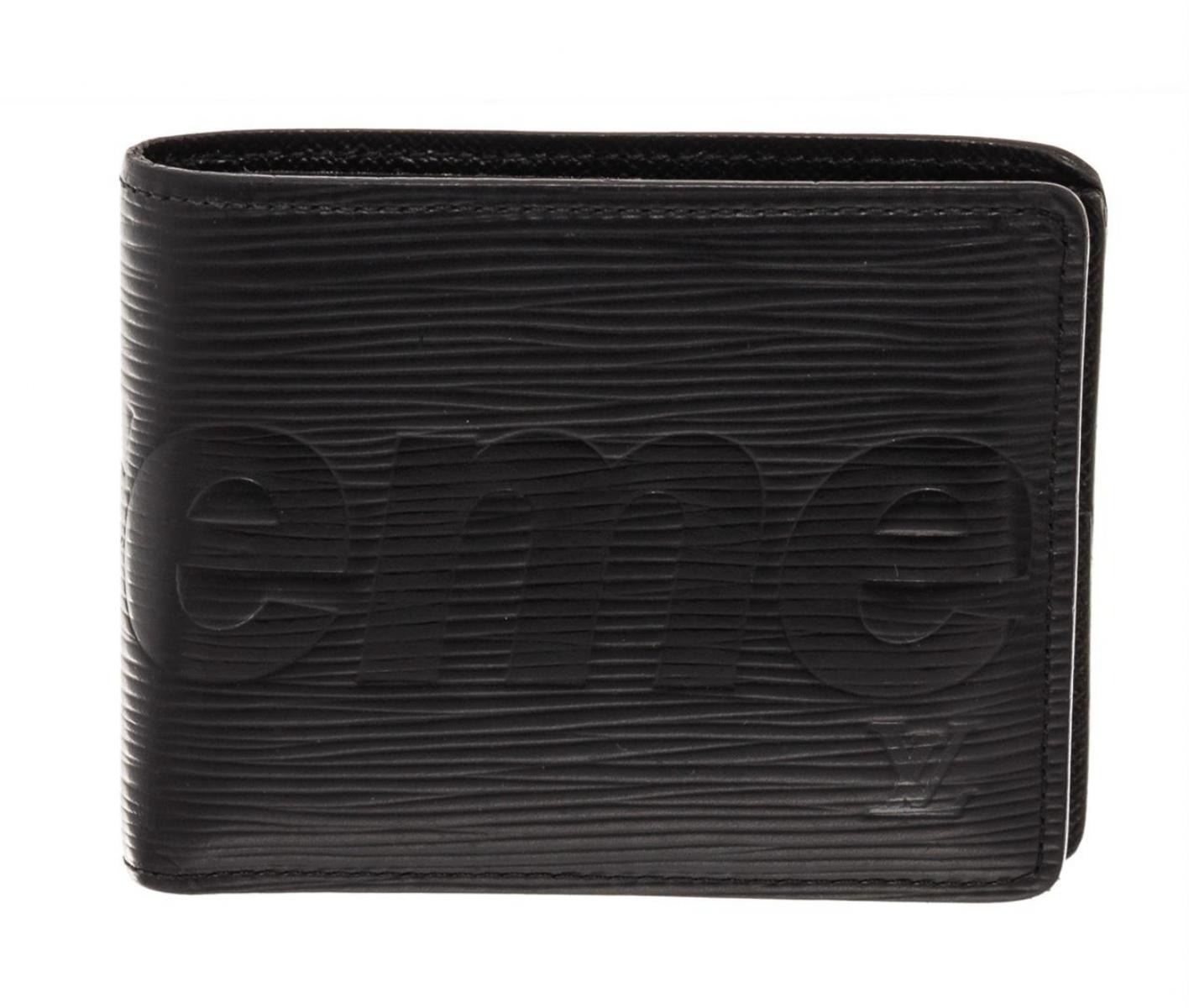 Mens black Epi leather Louis Vuitton x Supreme Slender Wallet with black debossed logo at exterior, tonal leather interior, dual interior bill compartments, eight interior card slots and flap closure. 6 HHeight 3.5" Width: 4.5" Depth: 0.5"