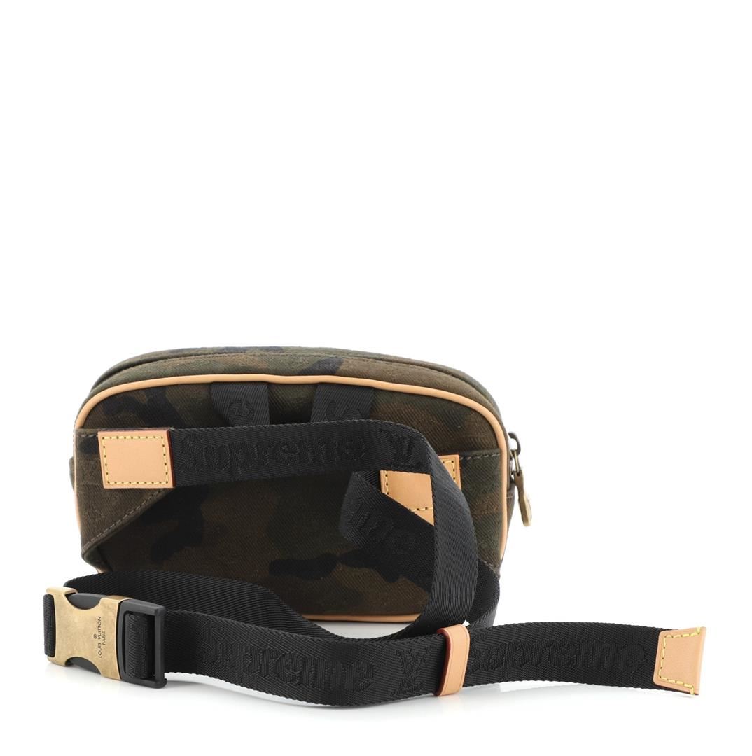 One Louis Vuitton x Supreme Green Camo Canvas Limited Edition Bum Bag. Item is sold AS-IS. All available information is listed in the description and shown in the photo. Louis Vuitton x Supreme Black Green Multicolor Camo Canvas Limited Edition Bum Bag features a thick camouflage woven canvas with jacquard LV monogram pattern, tan leather signature Supreme box logo label on front, tan leather trim with tan edging, Louis Vuitton logo engraved metal hardware, black web strap with woven Supreme and LV logos. Height 4.5", Width 7.5", Depth 2", Strap Drop 16.5-21"