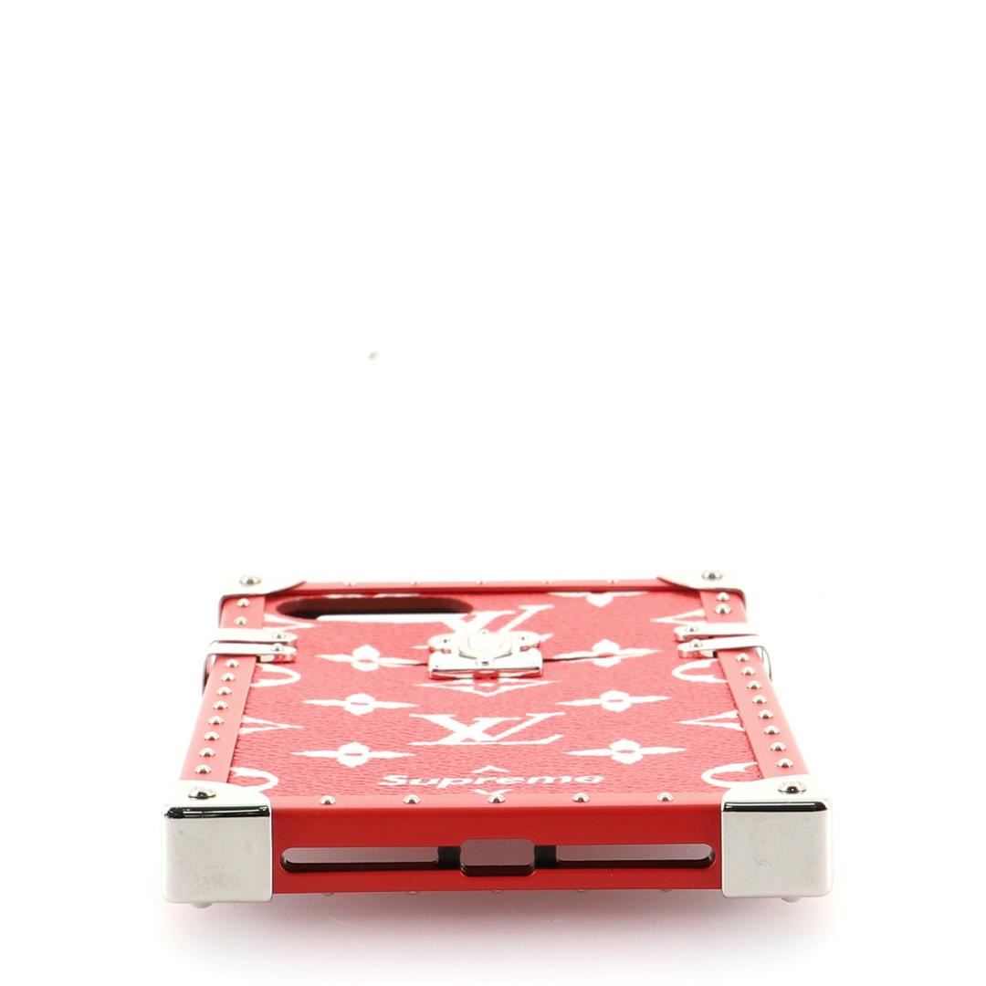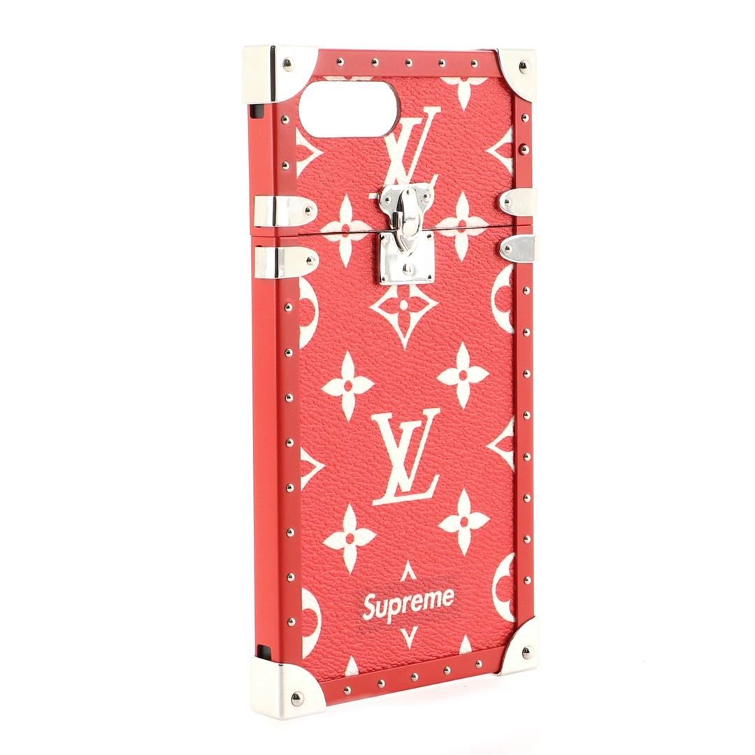 The case holds an iPhone 7 perfectly with a red microfiber interior and has shiny golden color metal pieces, adorned with the LV and Supreme logo in white and further accentuated with silver-tone hardware.
