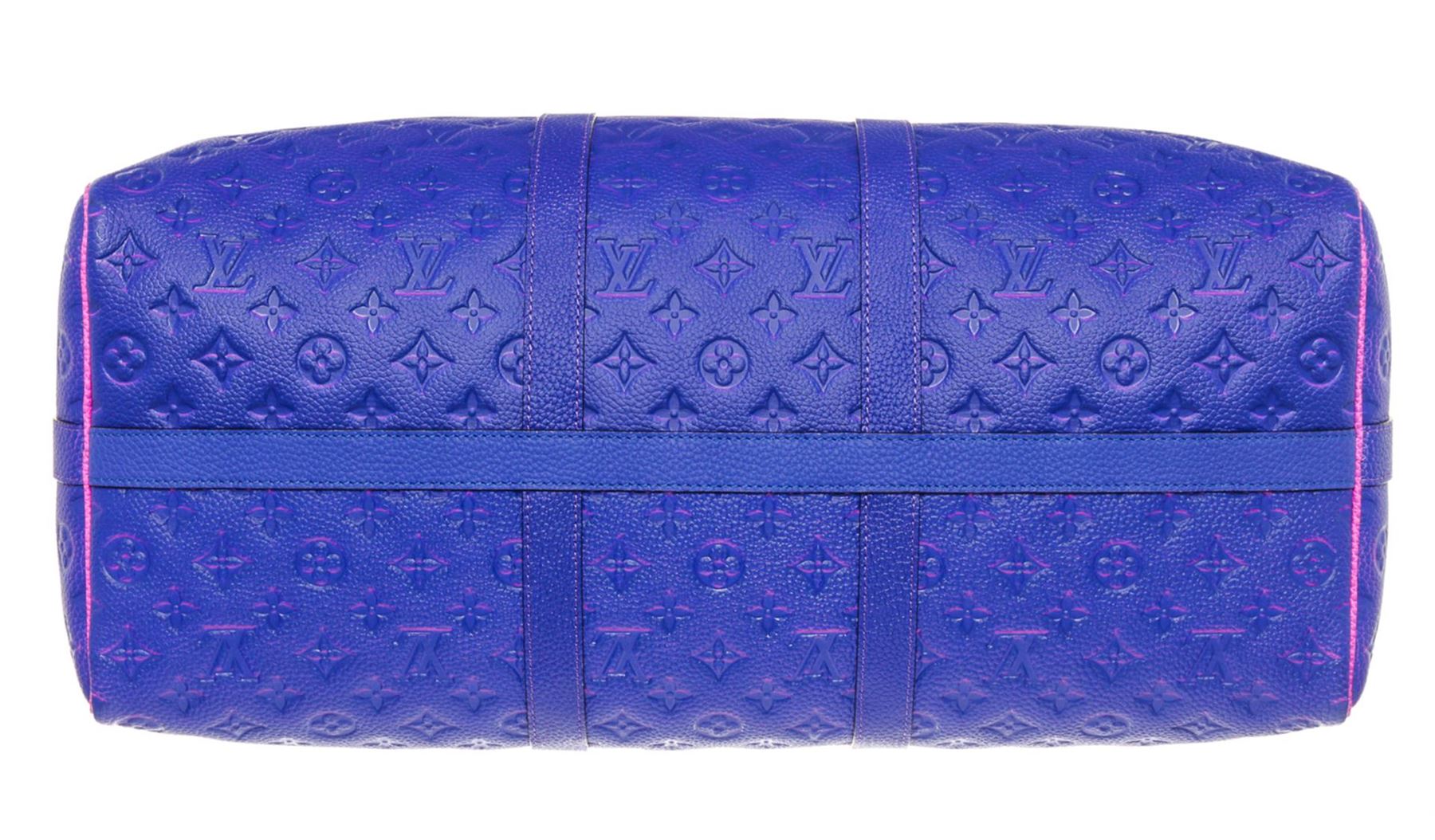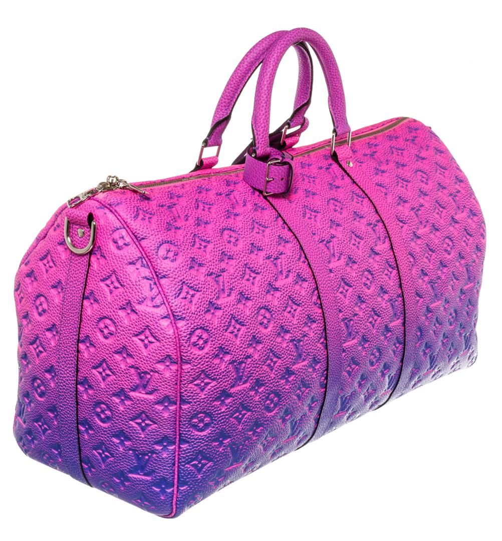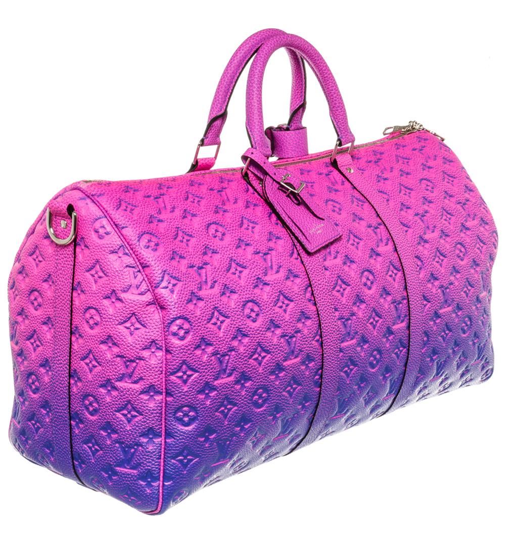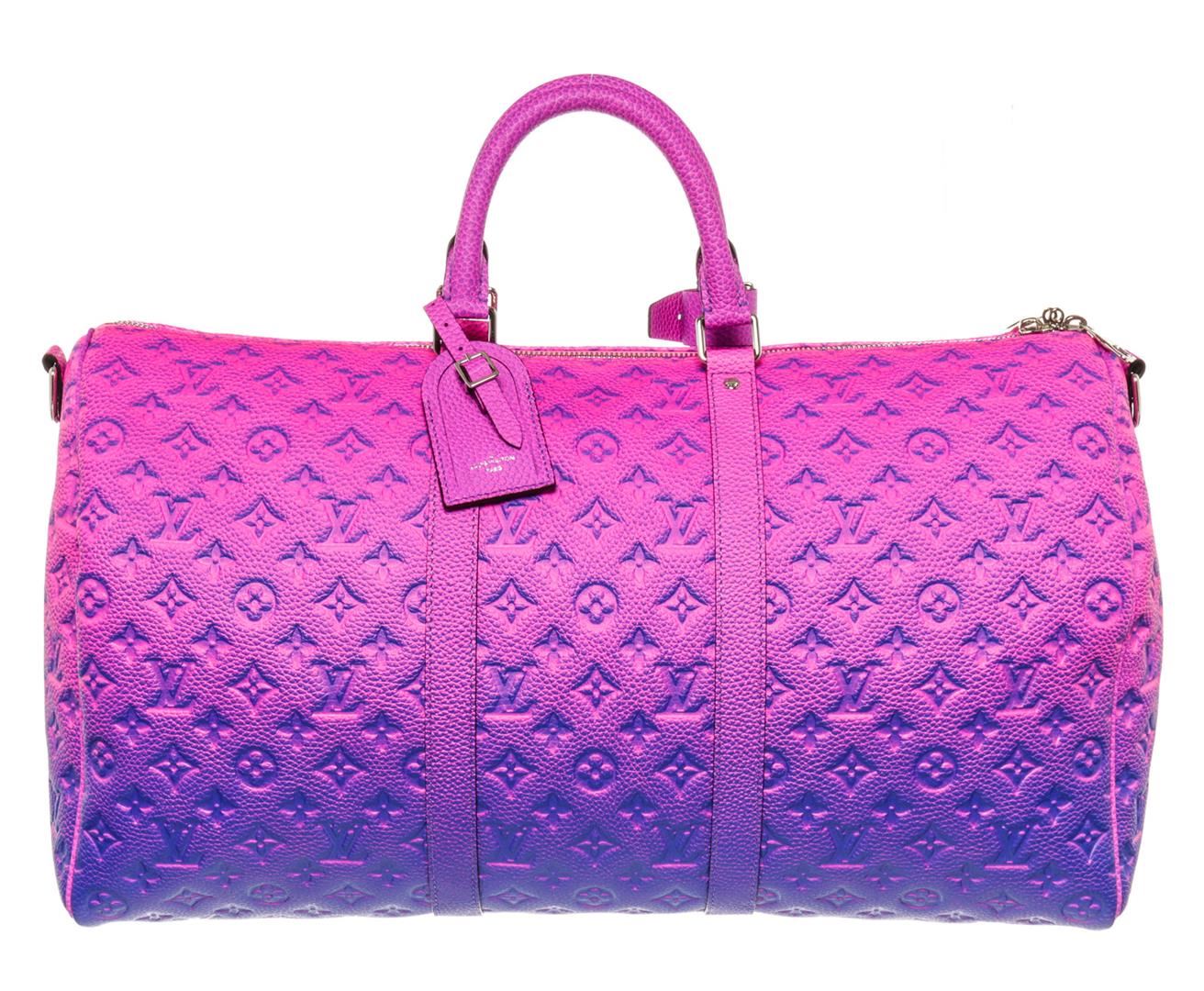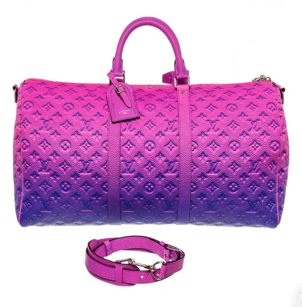 Purple, pink and blue monogram Taurillon Illusion leather Louis Vuitton x Virgil Abloh Keepall Bandouliere 50 with silver-tone hardware, dual rolled handles & single adjustable shoulder strap that can be detached, blue twill lining & single interior pocke