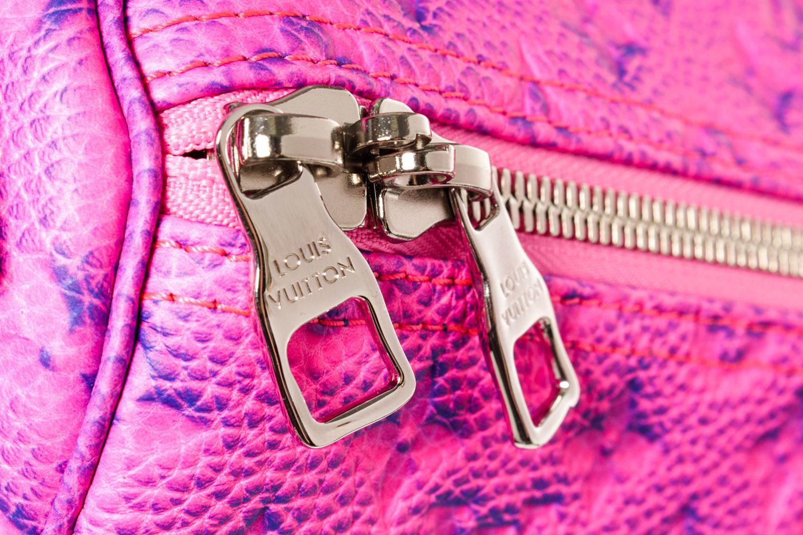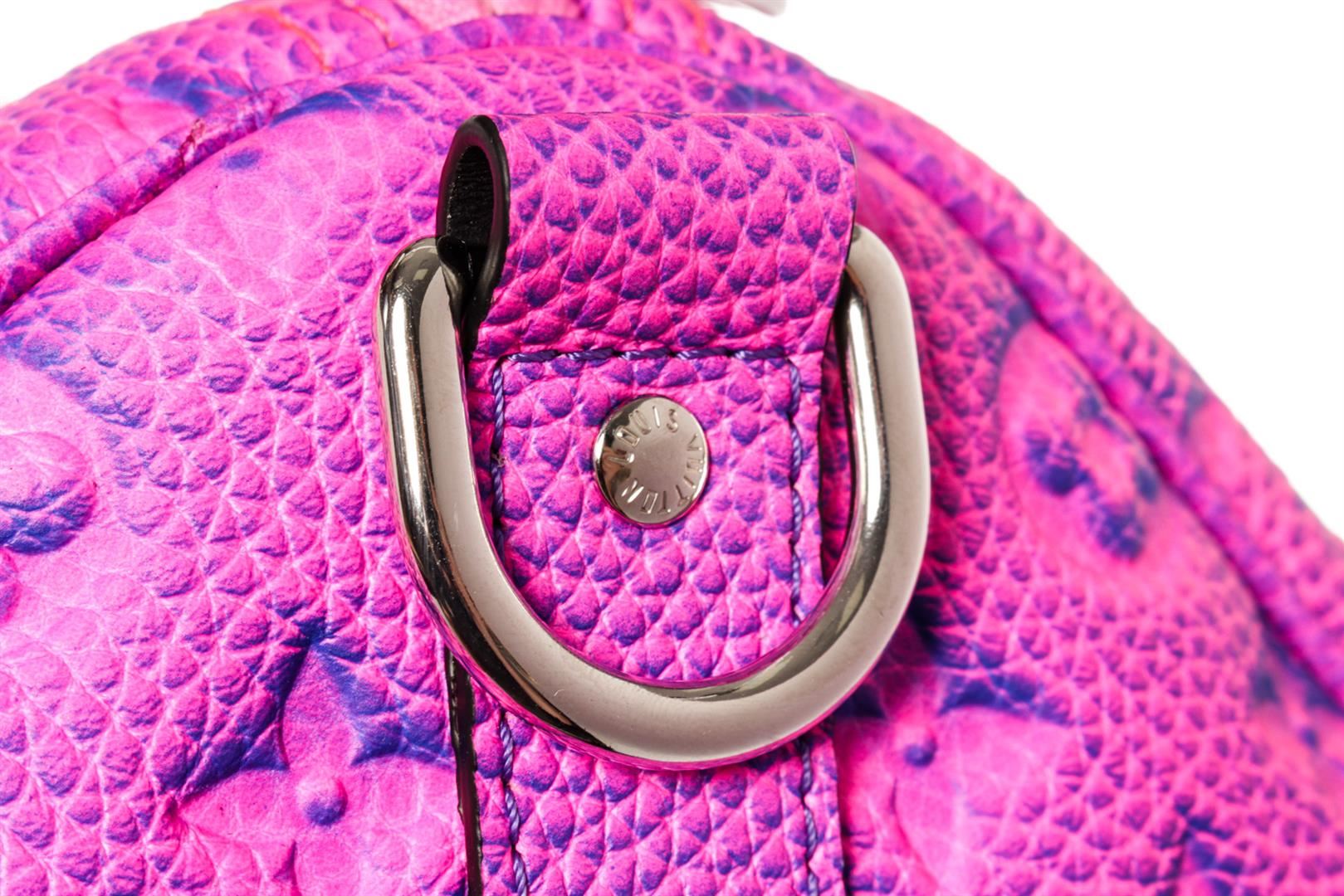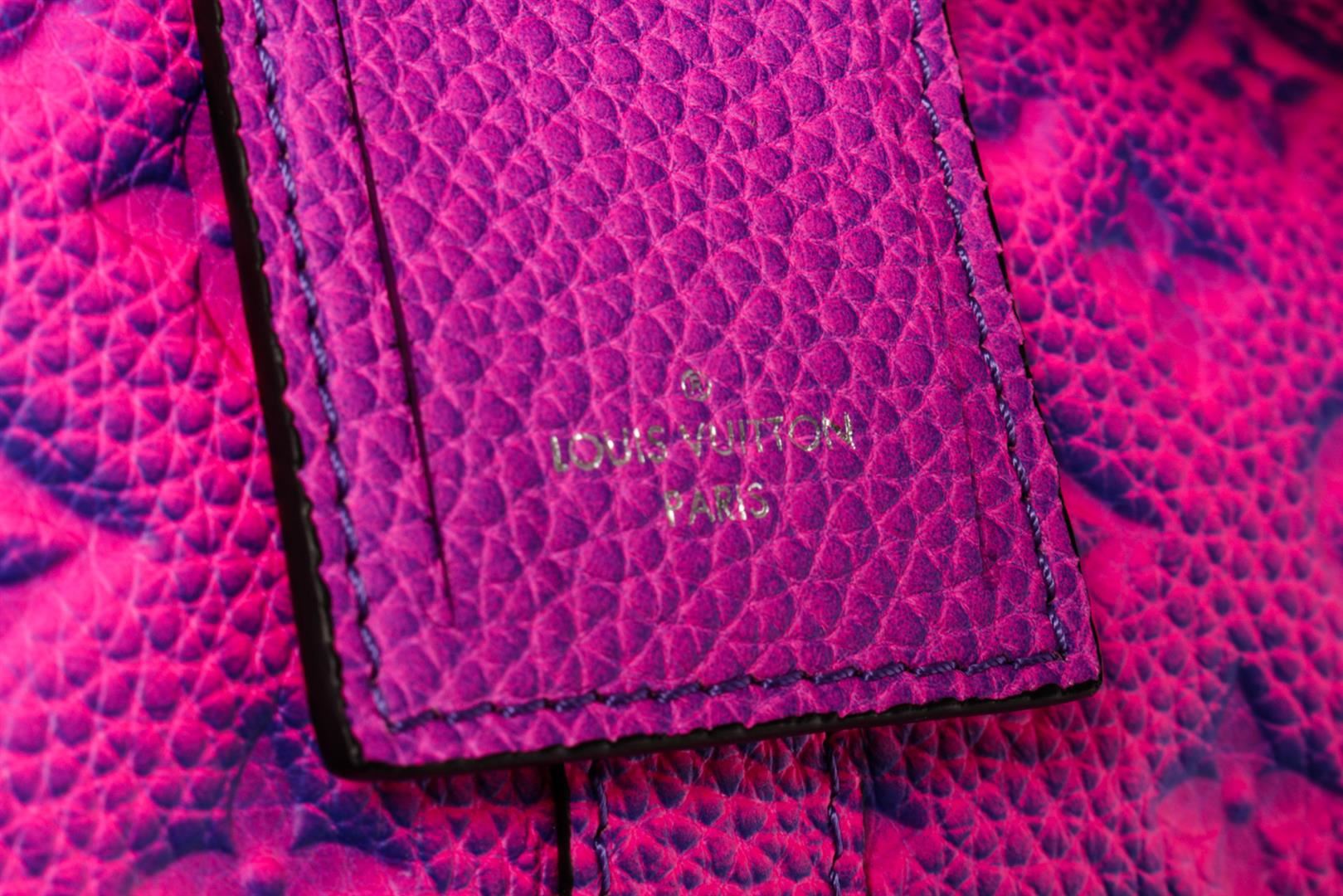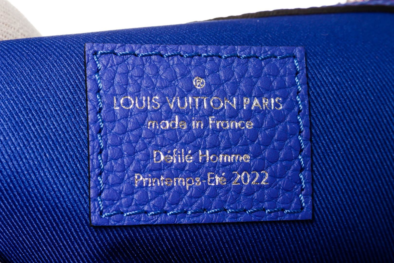 Purple, pink and blue monogram Taurillon Illusion leather Louis Vuitton x Virgil Abloh Keepall Bandouliere 50 with silver-tone hardware, dual rolled handles & single adjustable shoulder strap that can be detached, blue twill lining & single interior pocke