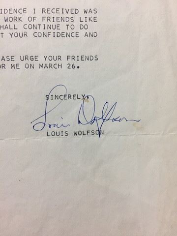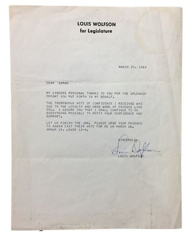 A letter addressed to Sarah from the controversial businessman and corporate raider Louis Wolfson asking for her help in spearheading a change in legislation. This letter is dated March 20, 1963. This is good condition.