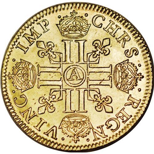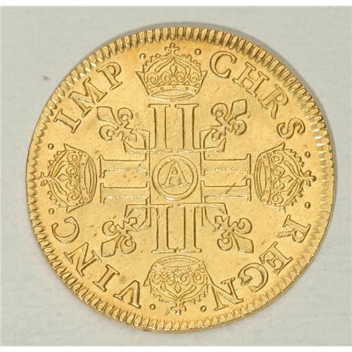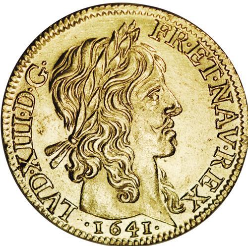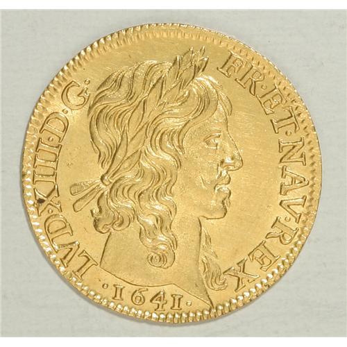 <B>Louis XIII gold Louis d'or a la meche longue, sans baies 1641A (Paris),</B></I> Laureate bust right/A cross of four cruciform, crowned double L's, fleur de lis in angles, F-410, Gad-58, Dup-1298, Ciani-1613, 6.79 gm, Choice UNC. Well struck with full luster. Rare in this condition.<BR><I>From the Sanssouci Collection</B></I><BR><BR><b>Shipping:</b> Coin/Currency (<a target="_blank" href="http://www.heritageauctions.com/common/shipping.php">view shipping information</a>)