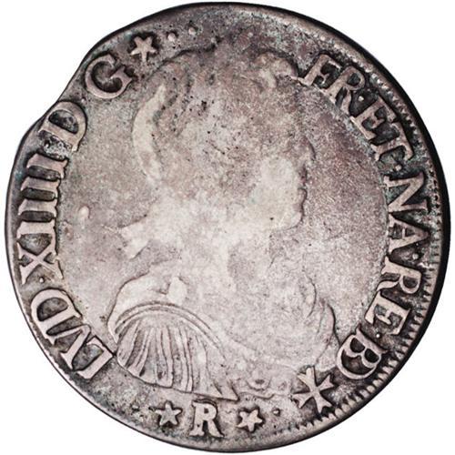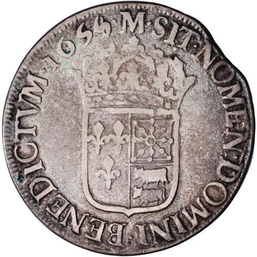 <B>Louis XIIII Ecu a la meche longue de France-Navarre-Bearn 1655R,</B></I> Bust right/Arms, KM181.1, Gad-204, VG with an edge flaw, as made, between 10 and 11 o'clock. The last 5 of the date appears to be over a 1. A very scarce issue.