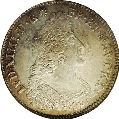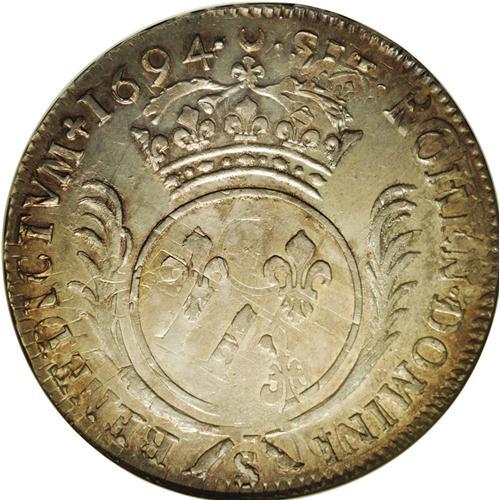 <B>Louis XIIII Ecu au palmes 1694S (Troyes Mint),</B></I> KM298.17, Gad-217, AU50 ANACS. Nicely toned with abundant remaining luster. Overstruck on a 1690 Ecu of 8 L with a clear date showing on the obverse. Very scarce in this condition.