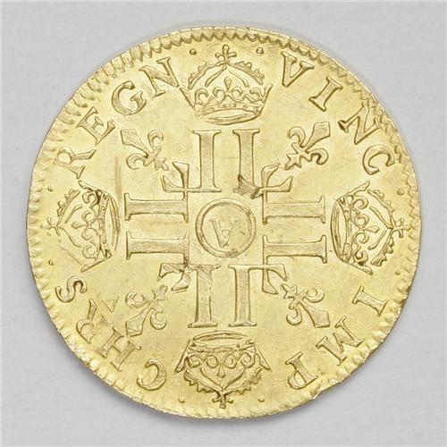 <B>Louis XIIII gold Louis D'or a la meche longue 1648A,</B></I> KM157.1, Fr-418, lustrous AU with light reverse abrasions and minor rim bumps. This very scarce piece has the small heart insignia denoting that it was struck at Medal Mint of the Louvre.