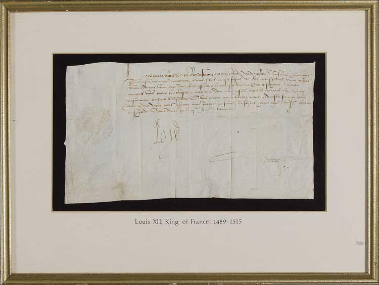 King of France and the sole monarch from the Valois-Orléans branch of the House of Valois (1462-1515). He reigned from 1498 to 1515 and pursued a very active foreign policy. Manuscript DS, in Latin, one page, 11 x 6.5. Neatly penned untranslated document, neatly signed at the conclusion “Louis.” Matted and framed to an overall size of 17 x 13. Intersecting folds, one through a single letter of signature, and scattered light wrinkling and toning, otherwise fine condition. Pre-certified PSA/DNA and RRAuction COA.