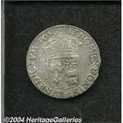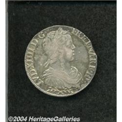 Louis XIV 1/2 ecu a la meche longue de France-Navarre-Bearn 1650-Pau, Laureate, draped, and mailed bust right, long curl before ear/Crowned shield of France, Navarre, and Bearn, Gad-171, C-1859, Dup-1478, KM-184.1, VF. Very Scarce.From the Enterprise Collection. Important notice: Heritage usually auctions material at the rate of 200-250 lots per hour. On some occasions eBay Live bid software or the Internet may not be able to keep up with the pace of the auction. We recommend placing a realistic absentee bid now as insurance to avoid disappointment. Occasionally the auctioneer may eliminate or reject an eBay Live bid, and the auctioneer may also reopen a lot after the close of the eBay live bidding (usually because we missed an audience bid), and may reject your bid even if it shows you as the winning bidder. By bidding via eBay Live, you agree that Heritage may award the lot to another bidder at its sole discretion under the circumstances described above or any other reasonable circumstances. Also please note that all Heritage lots purchased through eBay Live carry a 20% Buyer's Premium. Please make sure you read the Terms and Conditions before you bid.