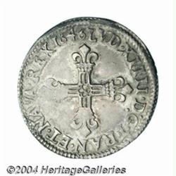 Louis XIV 1/8 ecu, frappe au marteau 1646L, Cross fleuree/Crowned shield of France dividing value, VIII, Gad-126, C-1827, Dup-1456, KM-141.8, VF.From the Enterprise Collection. Important notice: Heritage usually auctions material at the rate of 200-250 lots per hour. On some occasions eBay Live bid software or the Internet may not be able to keep up with the pace of the auction. We recommend placing a realistic absentee bid now as insurance to avoid disappointment. Occasionally the auctioneer may eliminate or reject an eBay Live bid, and the auctioneer may also reopen a lot after the close of the eBay live bidding (usually because we missed an audience bid), and may reject your bid even if it shows you as the winning bidder. By bidding via eBay Live, you agree that Heritage may award the lot to another bidder at its sole discretion under the circumstances described above or any other reasonable circumstances. Also please note that all Heritage lots purchased through eBay Live carry a 20% Buyer's Premium. Please make sure you read the Terms and Conditions before you bid.