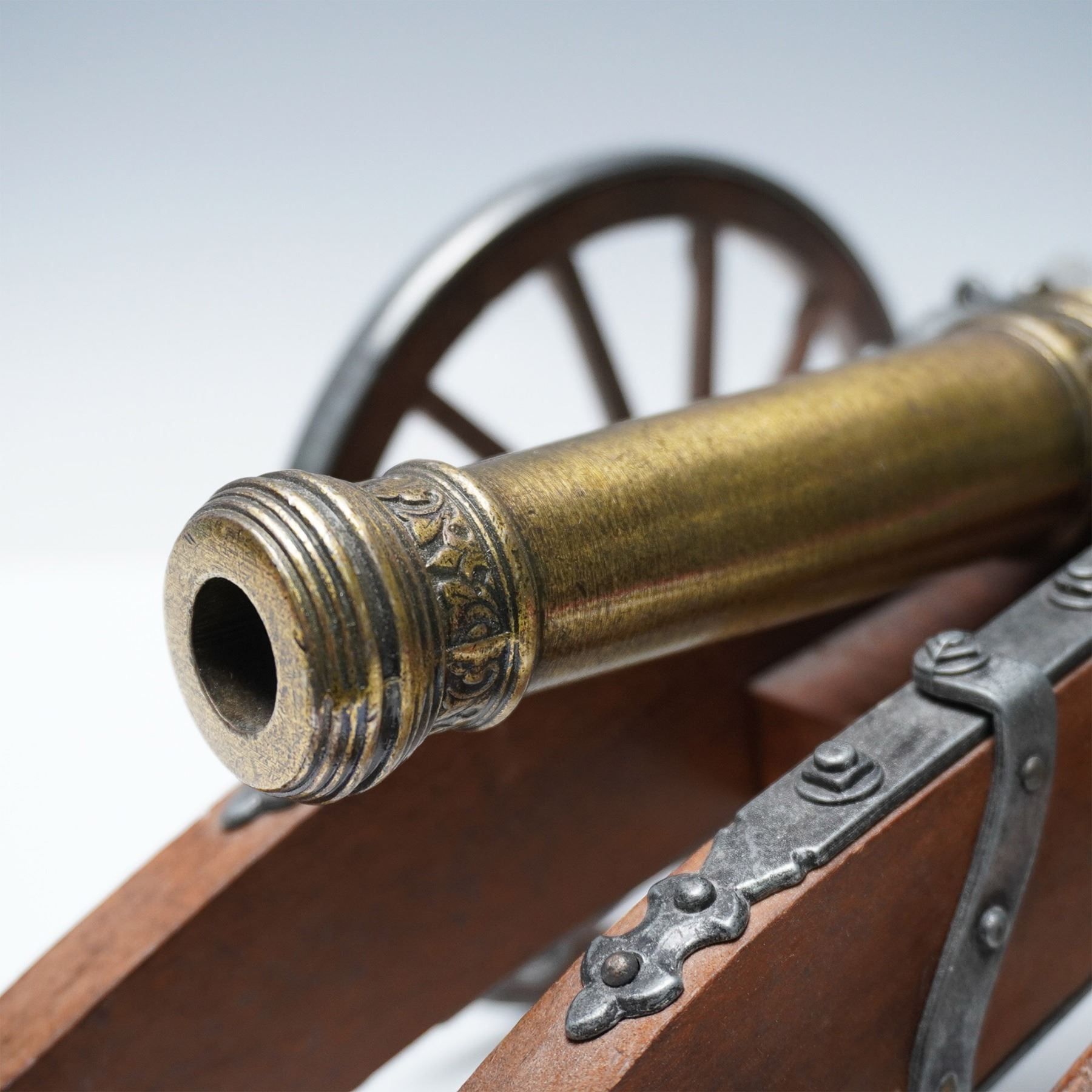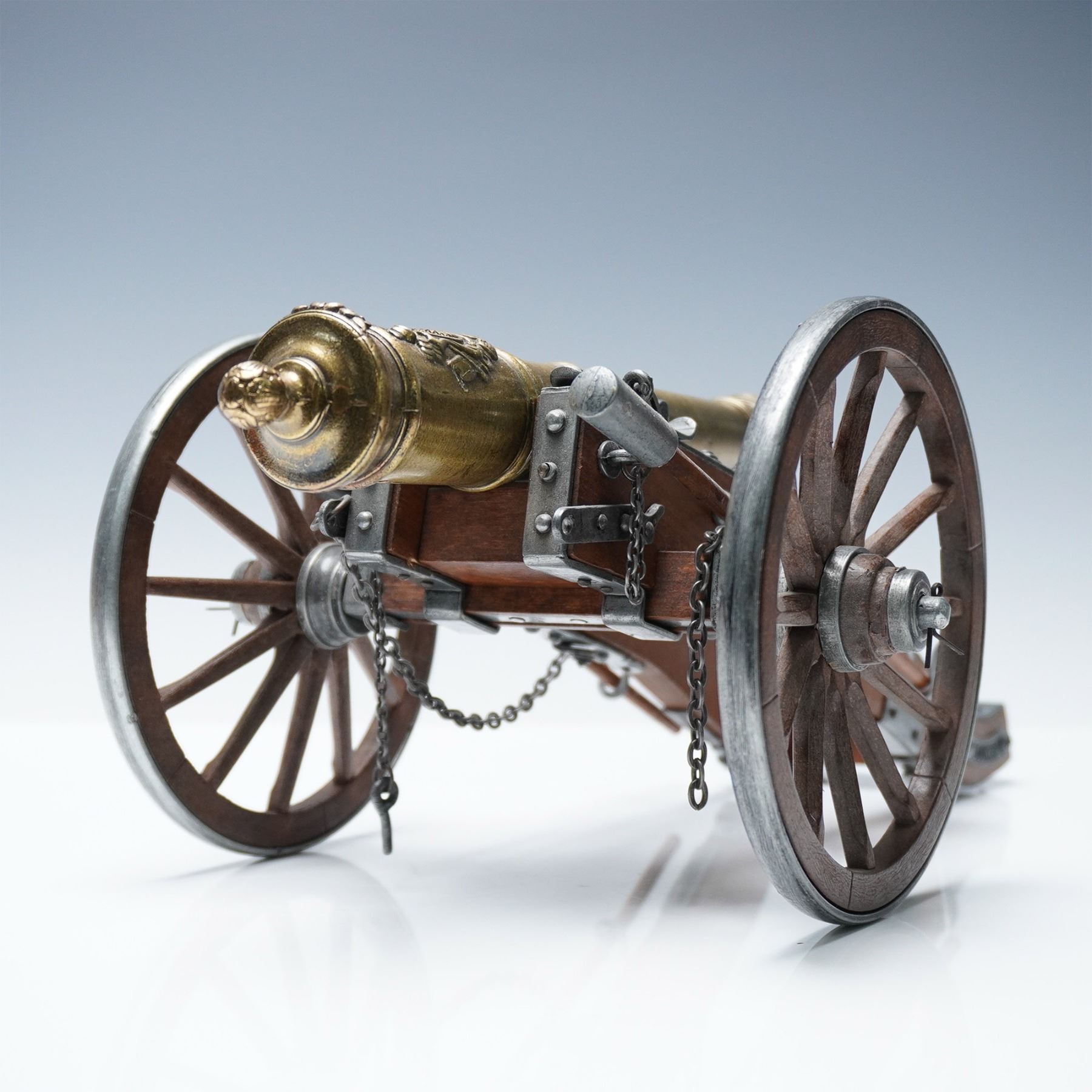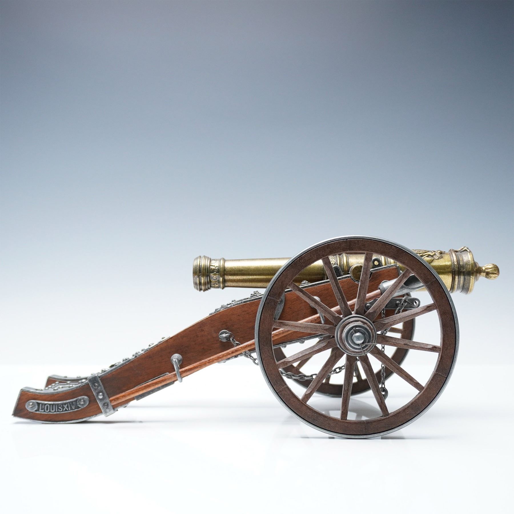 A striking replica of a Louis XIV-era field cannon, featuring exquisite craftsmanship with a richly detailed bronze-toned barrel adorned with an embossed crest and intricate scrollwork. This finely constructed model rests on a robust wooden carriage, complete with metal reinforcements, riveted details, and functional chain accents. The elegant wheels and realistic hardware make this an outstanding display piece, evoking the grandeur of 17th-century French artillery. The side of the carriage is marked "Louis XIV," paying tribute to the famed Sun King’s military innovations.