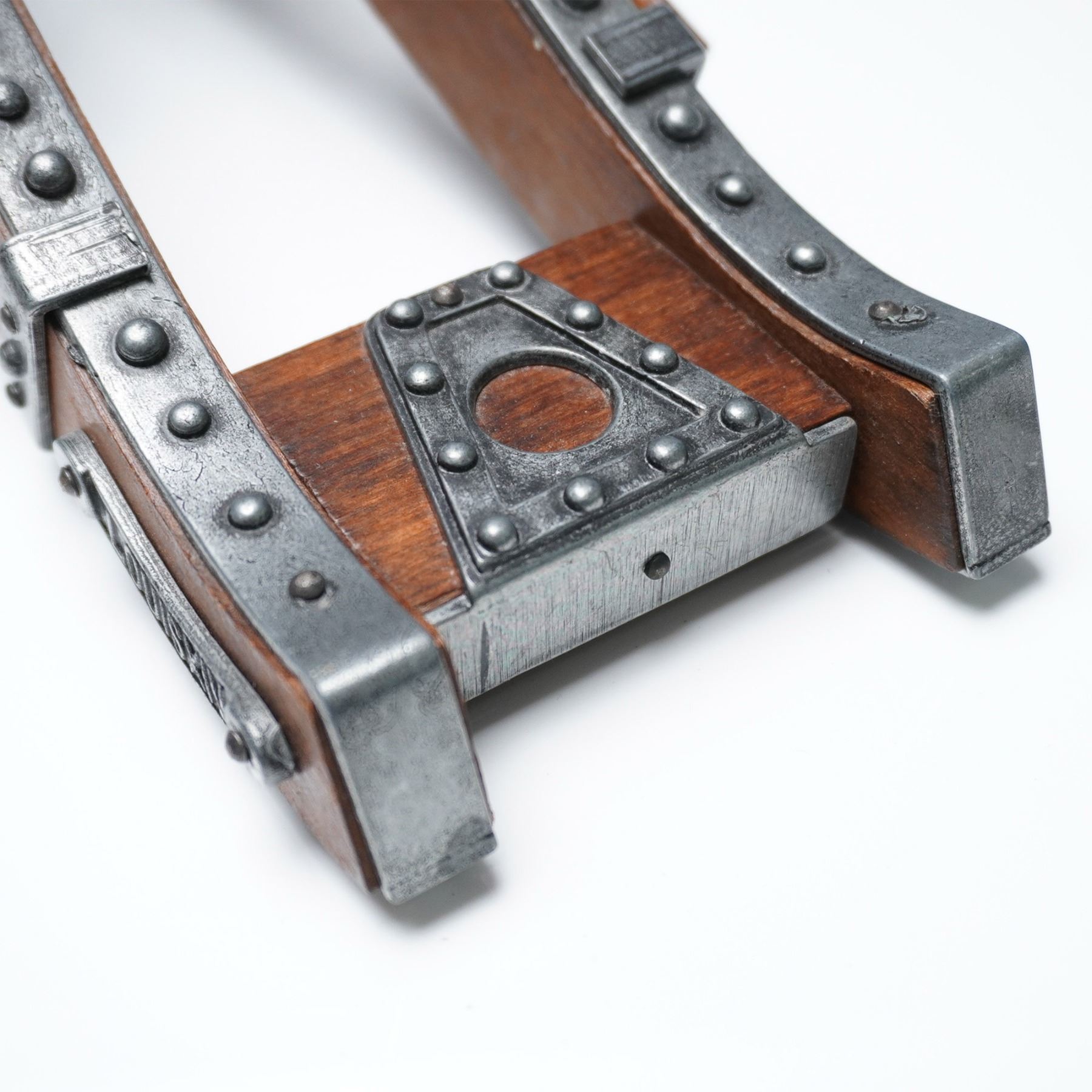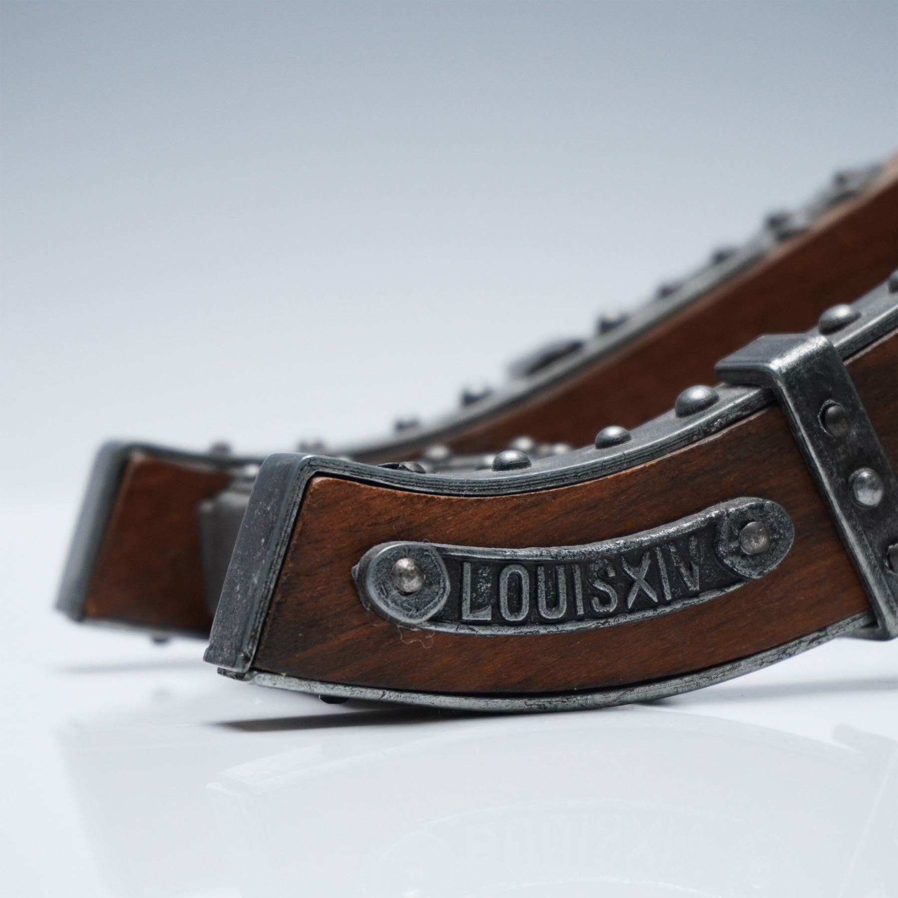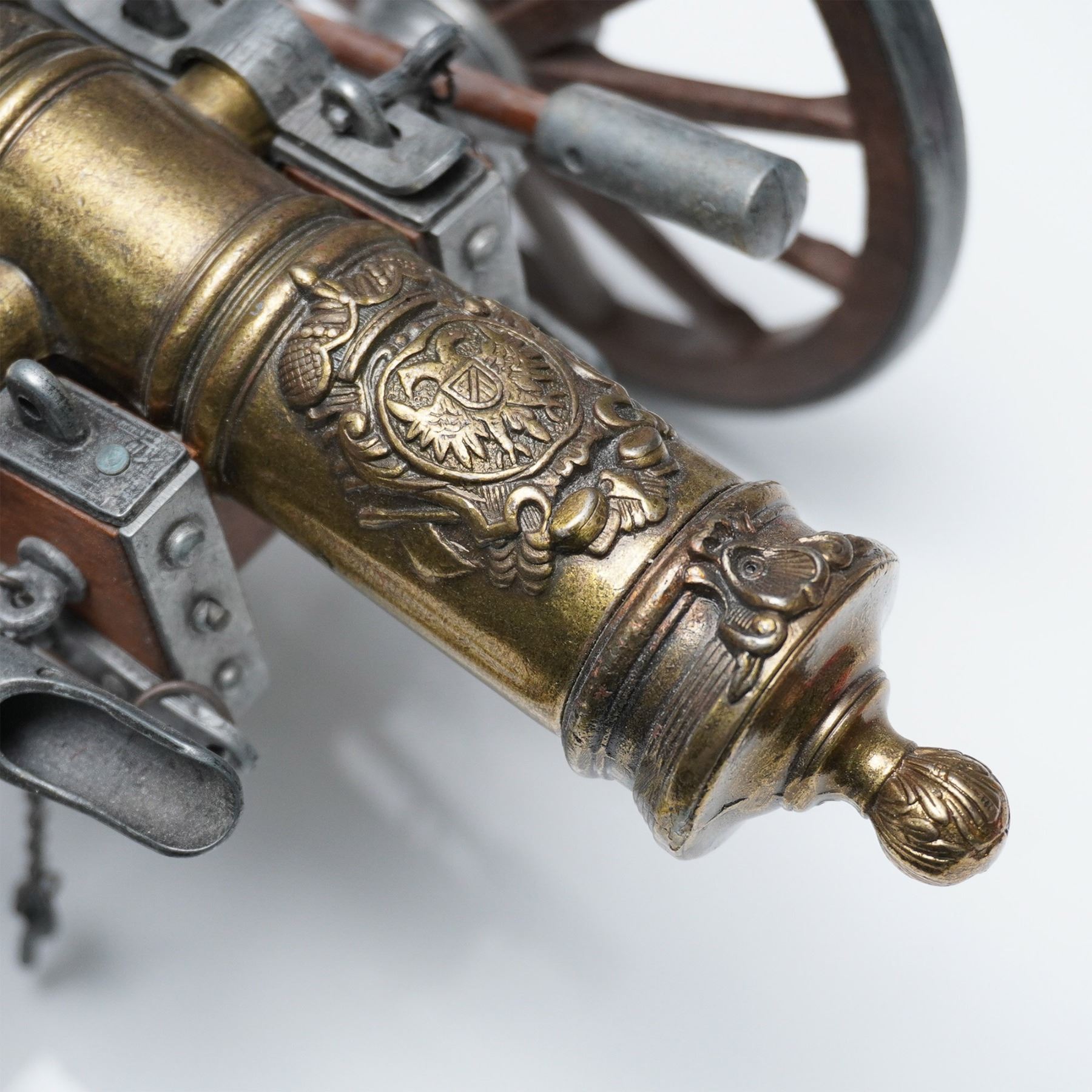 A striking replica of a Louis XIV-era field cannon, featuring exquisite craftsmanship with a richly detailed bronze-toned barrel adorned with an embossed crest and intricate scrollwork. This finely constructed model rests on a robust wooden carriage, complete with metal reinforcements, riveted details, and functional chain accents. The elegant wheels and realistic hardware make this an outstanding display piece, evoking the grandeur of 17th-century French artillery. The side of the carriage is marked "Louis XIV," paying tribute to the famed Sun King’s military innovations.