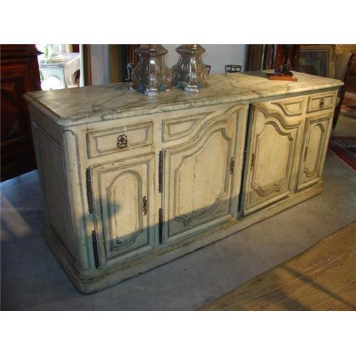 This is an antique Louis XIV style buffet from France. It it painted and has a faux marble top. It is still in good condition, except for some chipping to the paint and restoration to the base. We believe it to be circa 1900.