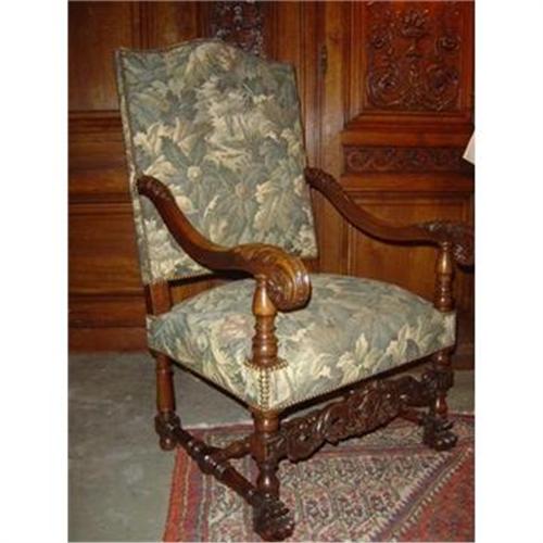This is a pair of Louis XIV styled armchairs from France. The wood is walnut, and the tapestry is machine made. Acanthus leaves adorn the arms, while a nicely carved cartouche decorates the front center. The feet are lion claw. Dimensions: Back Height=46 1/4,Width at Arms=26 1/2,Depth=26 1/4. Please contact us for more photos or information. Thank you, Le Louvre Antiques
