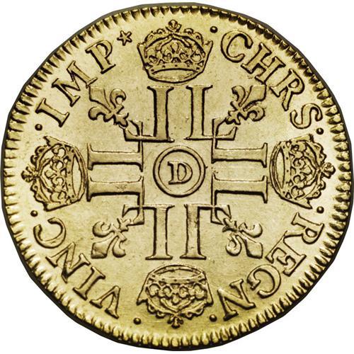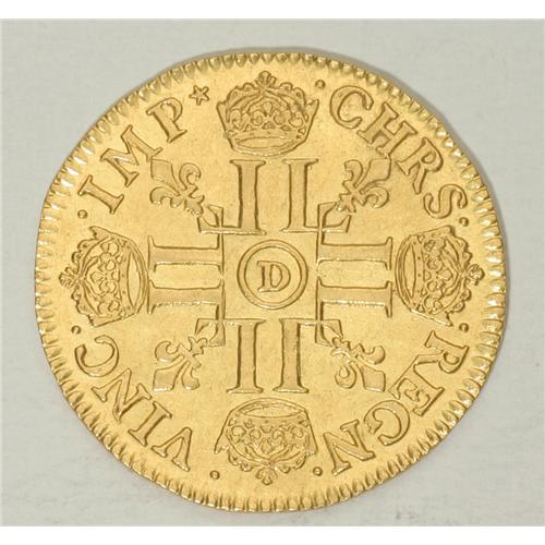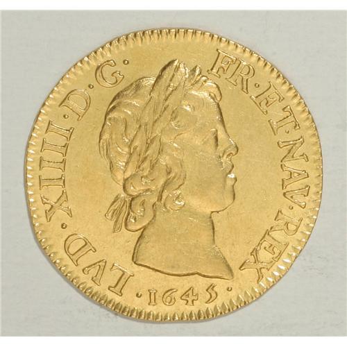 <B>Louis XIV gold Louis d'or a la meche courte 1645D (Lyon),</B></I> Laureate bust right/ A cross of four cruciform, crowned double L's, fleur de lis in angles, F-415, Gad-244, Dup-1419, Ciani-1781, 6.74 gm, lustrous AU. A rare, low mintage (8,150 pieces) issue of a very elusive type.<BR><I>From the Sanssouci Collection</B></I><BR><BR><b>Shipping:</b> Coin/Currency (<a target="_blank" href="http://www.heritageauctions.com/common/shipping.php">view shipping information</a>)