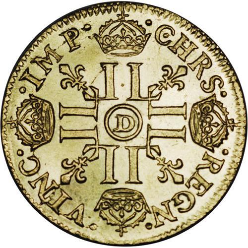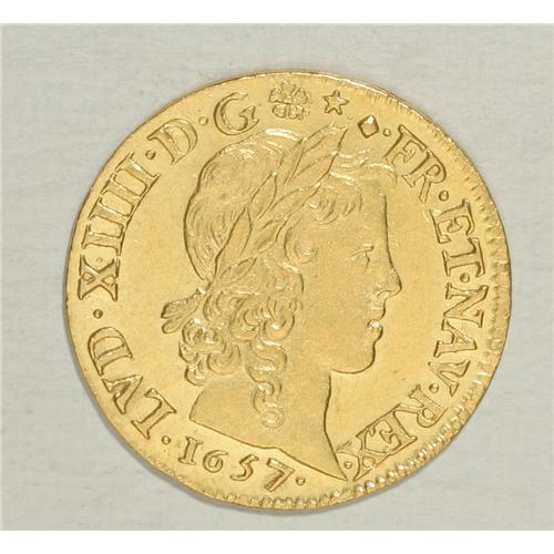 <B>Louis XIV gold Louis d'or a la meche longue 1657D (Lyon),</B></I> Laureate bust right/ A cross of four cruciform, crowned double L's, fleur de lis in angles, F-418, Gad-245, Dup-1422, Ciani-1787, 6.71 gm, brilliant UNC with prooflike fields and an amazing cameo appearance seldom seen with early French gold. Rare in this condition. A very scarce issue with a tiny mintage of only 1,286 pieces.<BR><I>From the Sanssouci Collection</B></I><BR><BR><b>Shipping:</b> Coin/Currency (<a target="_blank" href="http://www.heritageauctions.com/common/shipping.php">view shipping information</a>)