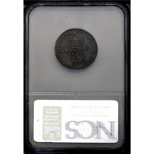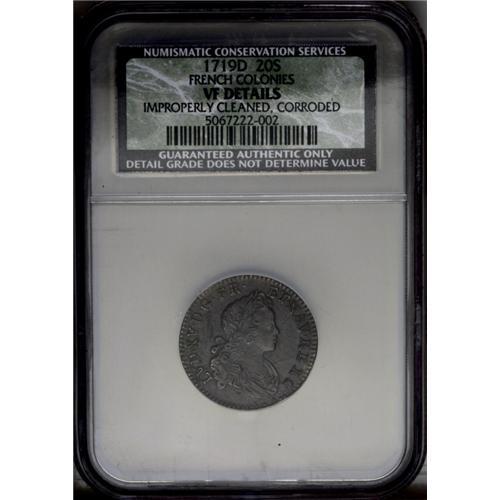 <B>1719-D Louis XV 1/6 Ecu (20 Sols)--Improperly Cleaned, Corroded--NCS. VF Details.</B></I> Young Bust right/Crowned quartered shield dividing value, Gad-295, Type of KM-440.1. Dark steel toning with hairlines and corrosion, and with scratches in the left obverse field. Although not specifically listed in the <I>Guide Book,</B></I> these are closely related to other French American and French Canadian issues.