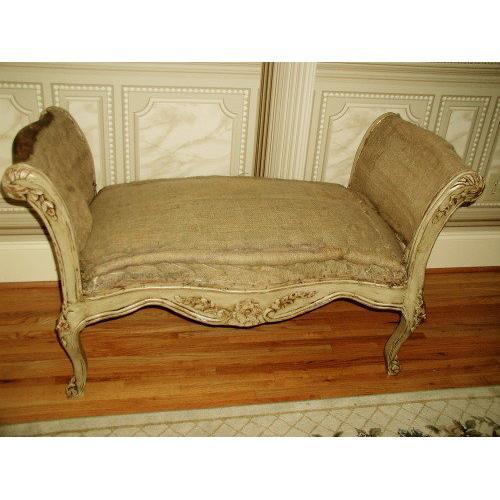 Large Louis XV bench from France late 19th century. Wonderful antique cream painted finish to blend with any deccor with bits of the wood showing through below. Outstanding carving of acanthus leaf and floral on all four sides of apron,high cabriole legs,escarot feet and large curved bolster arms. Springs and burlap covered seat in excellent condition ready for new upholstery. The wide seat makes an excellent bench for the end of the bed or out in a room. Sturdy and very well made. Measures 50L X 24D X 28.5H.