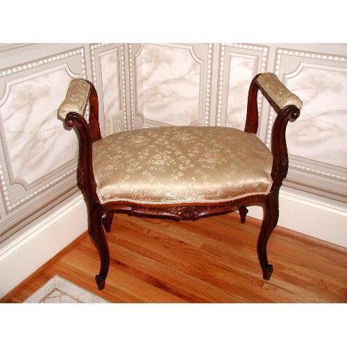 Gorgeous hand made and carved Louis XV walnut bench with high arms,early 19th century. Fine carving on the scalloped apron and high cabriole legs. The padded arms are still filled with straw as is the set which has had additional filler added many years prior. Covered in an antique cream floral brocade with accents of gold,pale green leaves and sprays of reddish rose. Edged in cream and gold gemp. The fabric in wonderful condition. Bench or stool in excellent condition. Measures 28.5L X 27H (top of arm) X 15.5 D. Seat height 19 from floor.