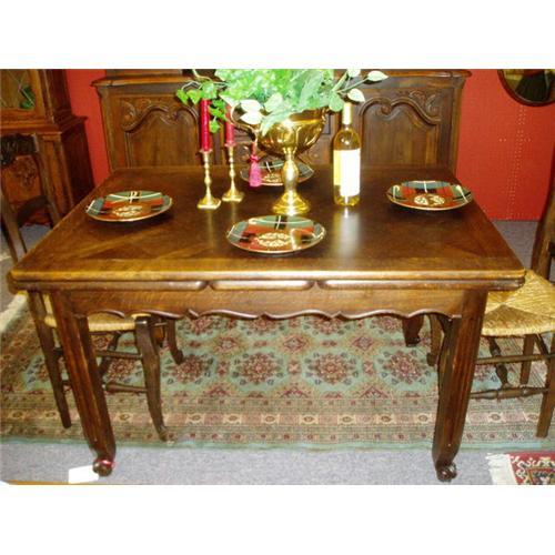 THIS COUNTRY FRENCH LOUIS XV STYLE TABLE IS MADE OF OAK. THE LEGS ARE FLUTED. IT HAS A PARQUET TOP AND THE TRADITIONAL FRENCH CABRIOLD FEET.