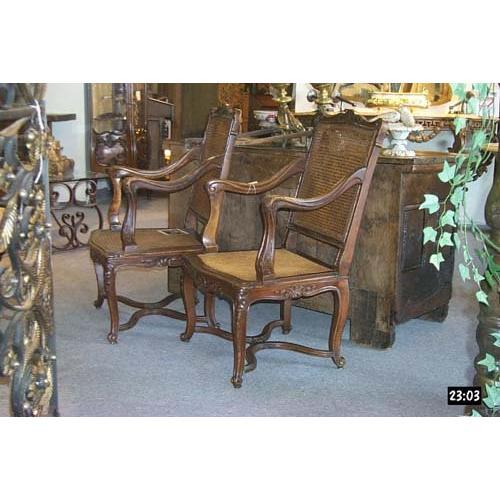This is a beautiful pair of walnut wood chairs from France. The style can be considered Louis XV or Regency. The caning is partially re-done, but we believe the chairs to be from the early 1800's. Please contact us for more photos or information. Thank you--Le Louvre Antiques