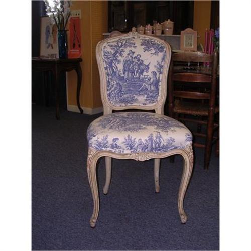 Beautiful Louis XV style chaise in toile. This chair has been upholstered recently. The distressed cream colored wooden frame is in very good condition with lovely floral engravings. Please feel free to ask for more detailed photos. Imported from the Sarthe region of France