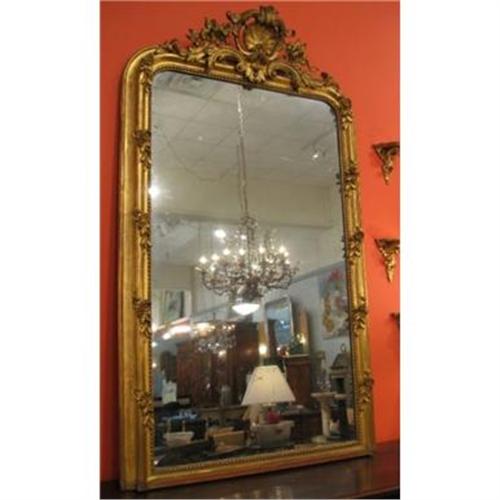 Louis XV style 23k gold leafed mirror with the original mercury glass and elaborate shell fronton.