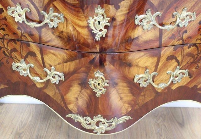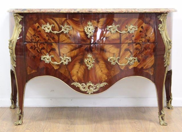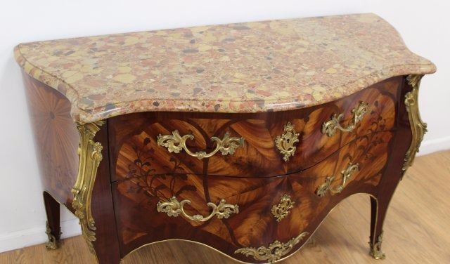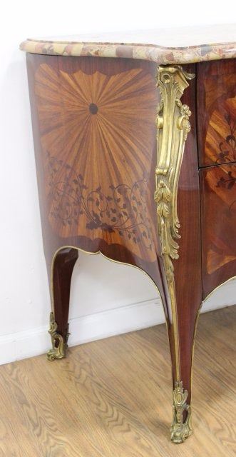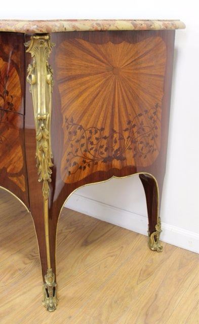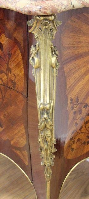 Circa 1900. Bronze mounted. Bombe shaped. Breche d'Alep marble top. Approx. 34 1/2" H x 56 3/4" W x 25 1/4" D.