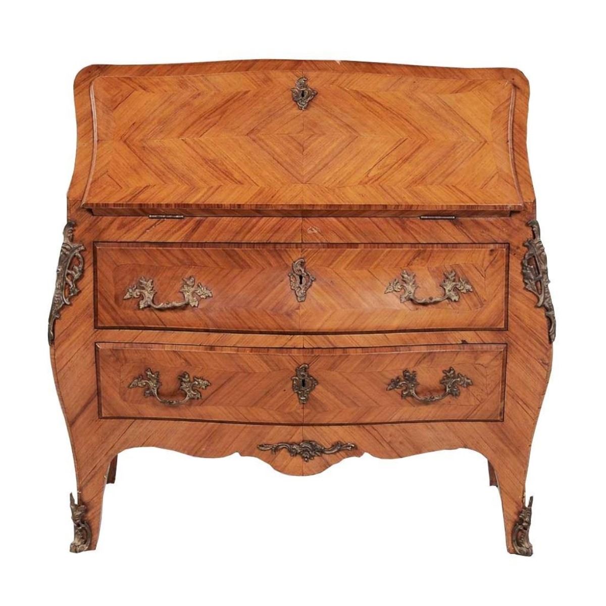 Early 20thc French Louis XV-style parquetry Bombe desk with fitted interior containing  two long drawers, 4 smaller interior drawers with ornate handles, parquetry veneers with bronze mounts & two interior shelves.Â