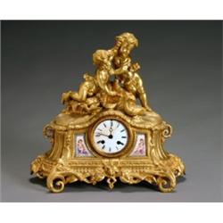 The two train movement striking on a bell, set within an ormolu case mounted with plaques of putti and surmounted by two ormolu putti fighting amidst ducks. Movement stamped Rollin/A Paris, 444 and with Japy FrFres medallion. Cracks to white enamel dial.