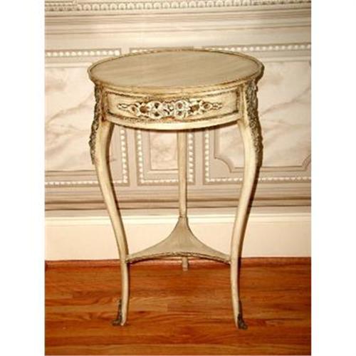 Louis XV round side table C.1920 has beautiful carving on the three recessed panels forming the apron and surrounded by rope trim. Tall delicate legs with shelf below with ornate edging. Brass mounts of acanthus leaf wreaths on knees as well as additional brass mounts on feet. Durable antique cream finish with darker highlighting has probably been revamped since the table's inception as in excellent condition.Wonderful size for all areas. Measures 29.5H X 18L X 18W.